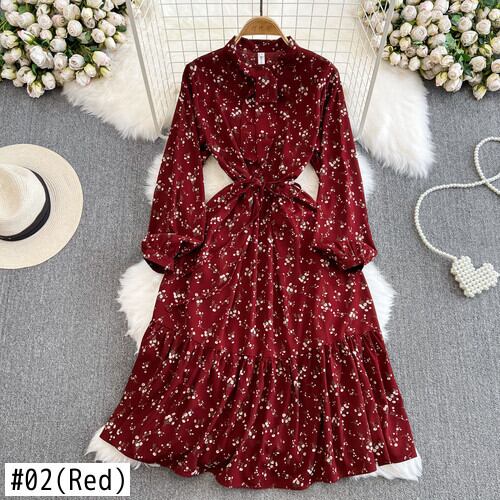 Nomikuma 印刷ランタン長袖秋ドレスレースアップスリムウエストリボン Badndage ドレス ロング オータム 秋物