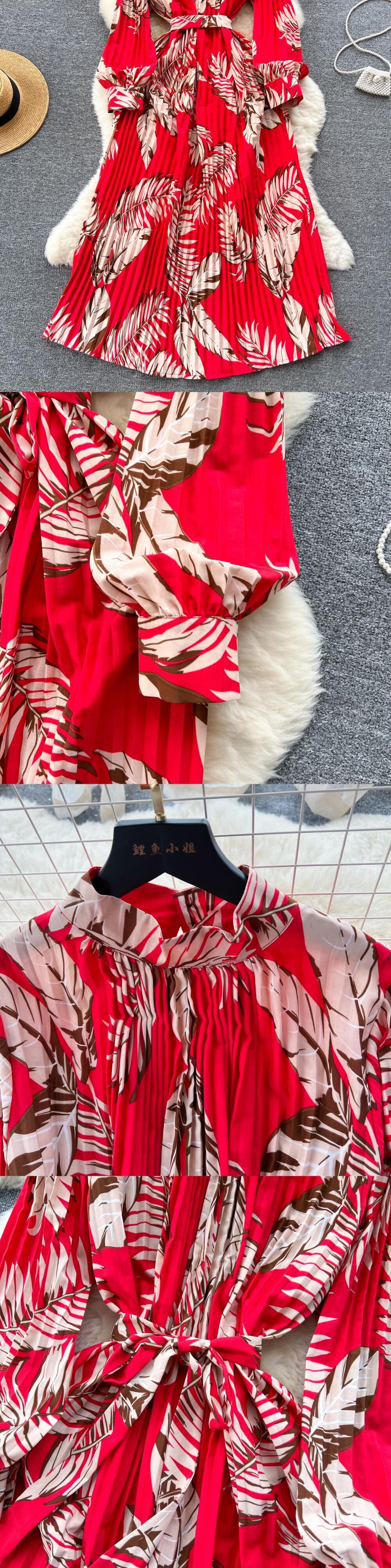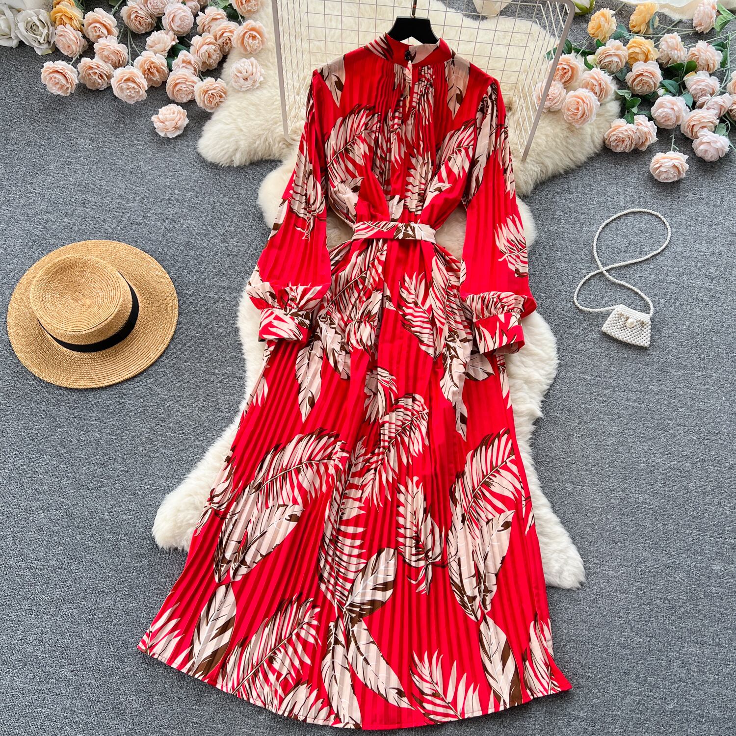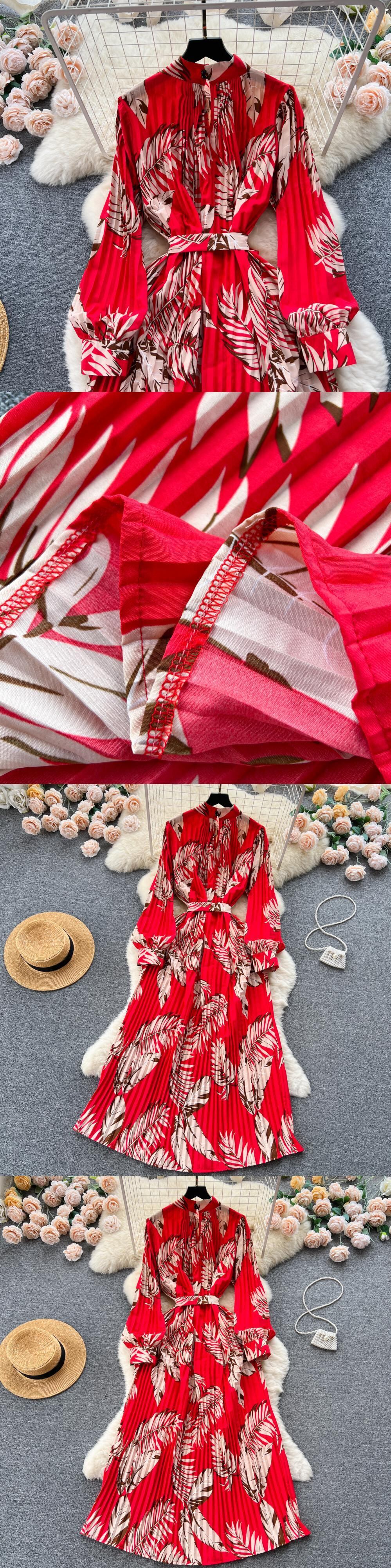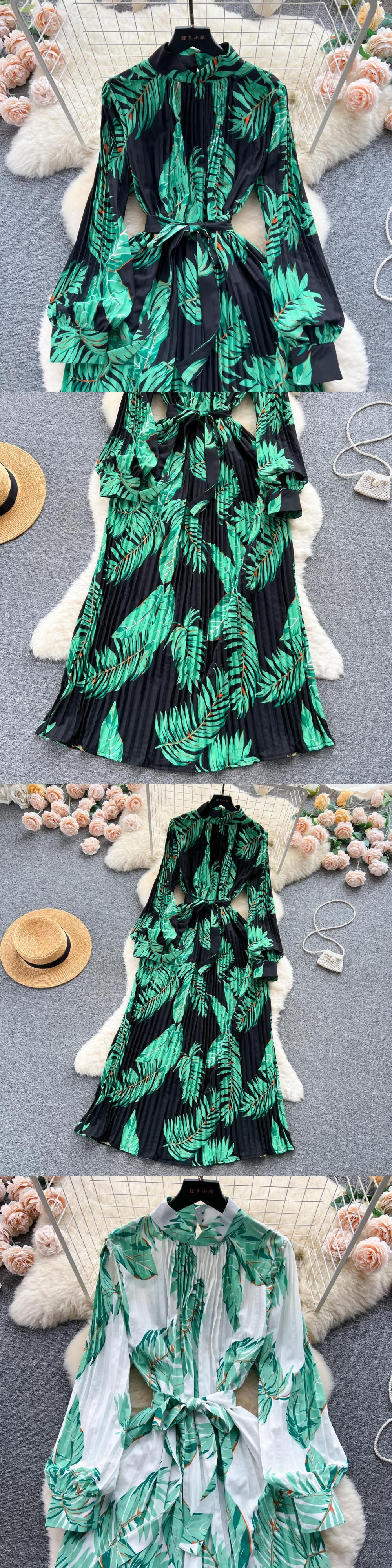 Nomikuma プリントドレススタンドネック長袖ドレス秋弓包帯スリムウエストロング Vestido リボン オータム 秋物