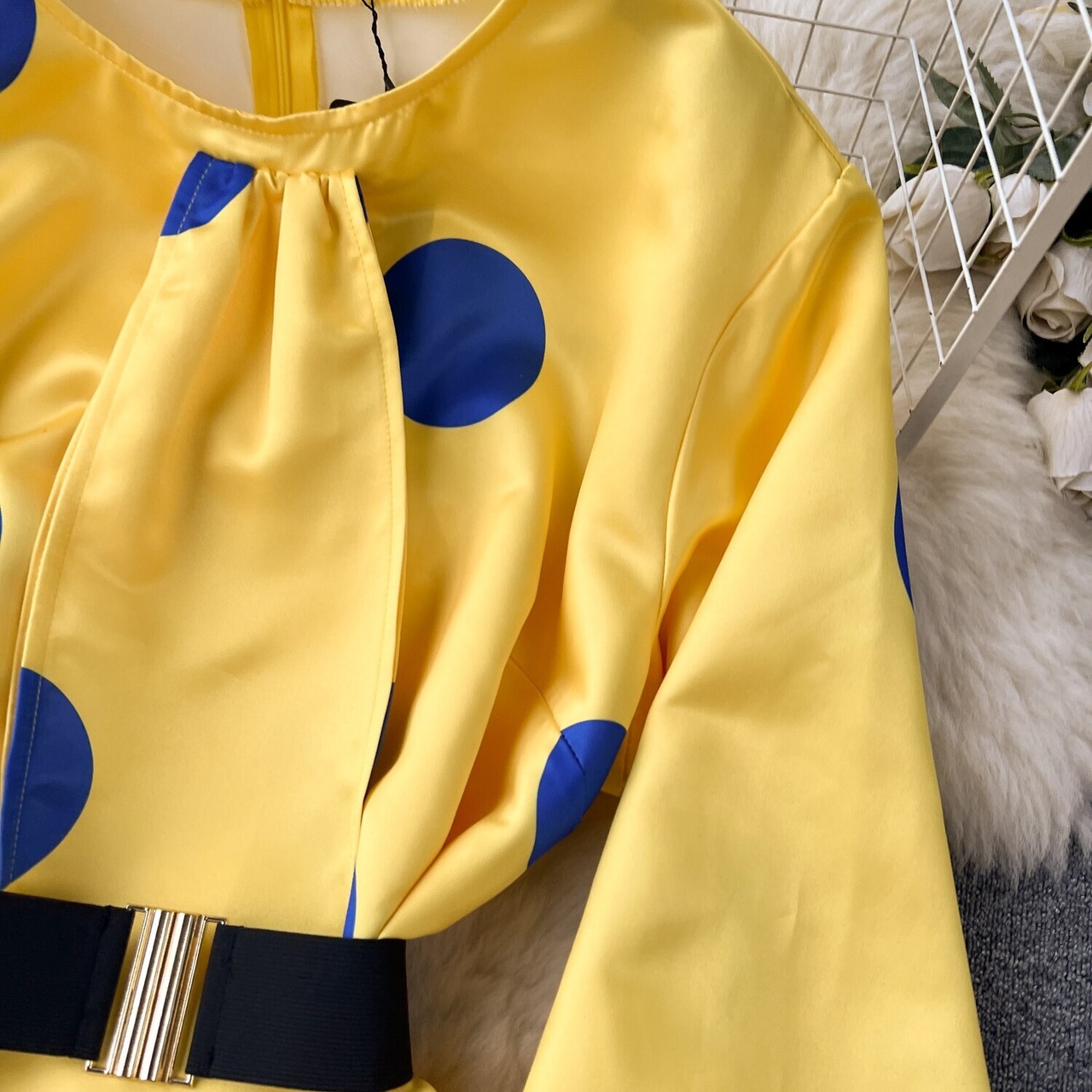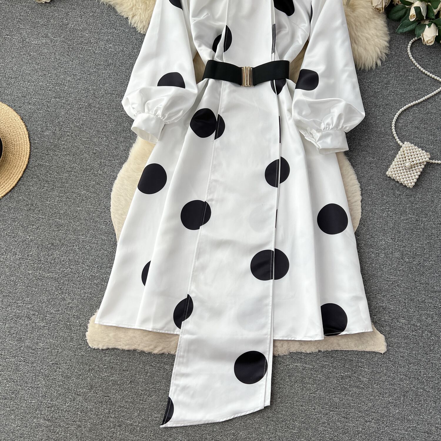 Nomikuma ドットドレス O ネックリボンロング Vestidos ランタンスリーブベルトスリムウエストドレス ハーネス Oネック