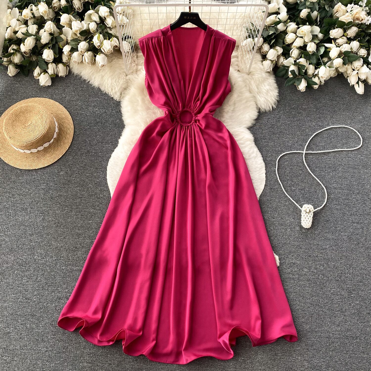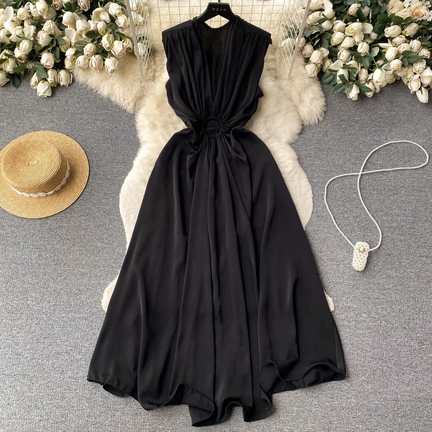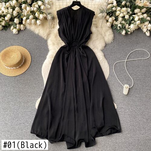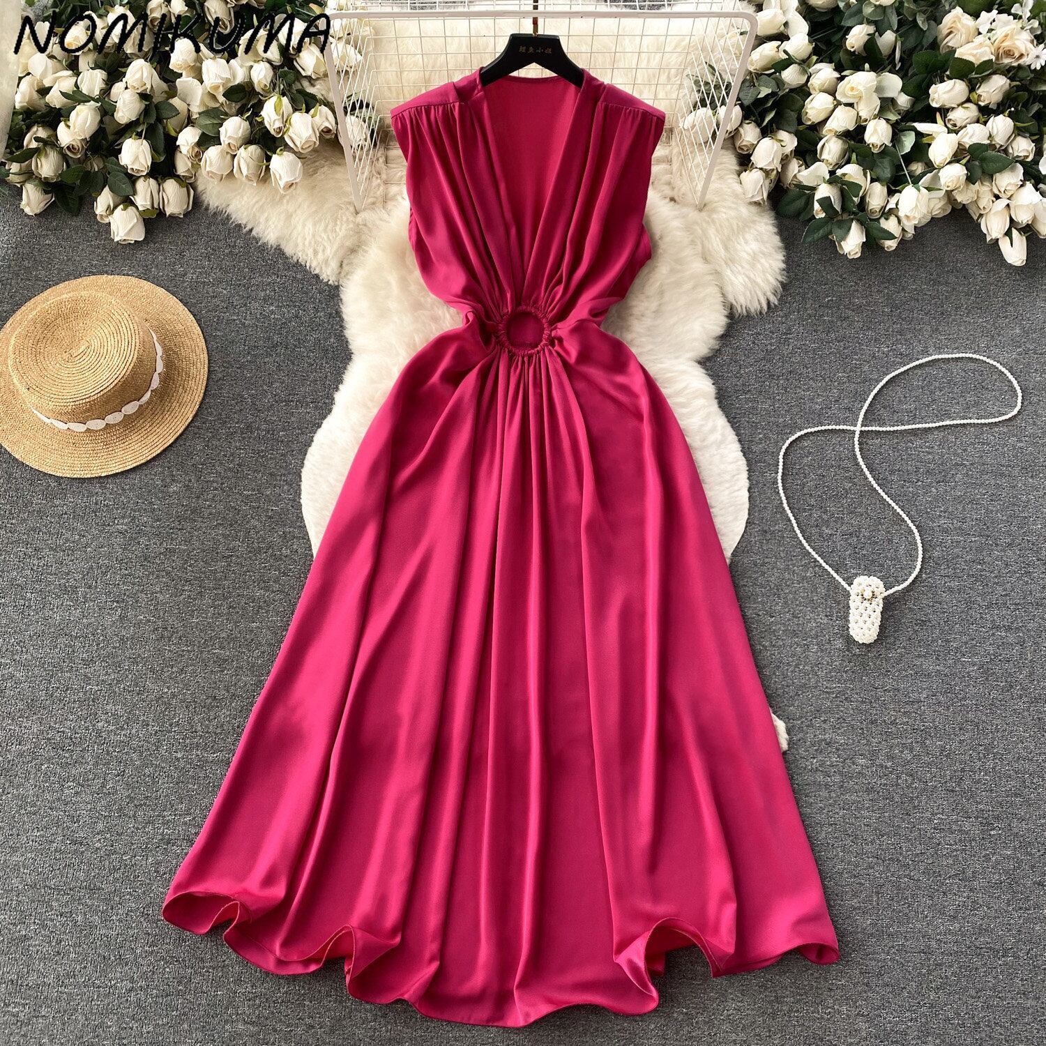 Nomikuma V ネックひだスリムウエスト中空アウトドレス夏シックサテンドレスノースリーブ因果 A ライン Vestidos サマー 夏物 Vネック Aライン
