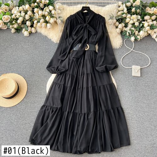 Nomikuma ベルトスリムウエストドレス弓包帯ドレスランタンスリーブ秋ロング Vestidos リボン オータム 秋物 ハーネス