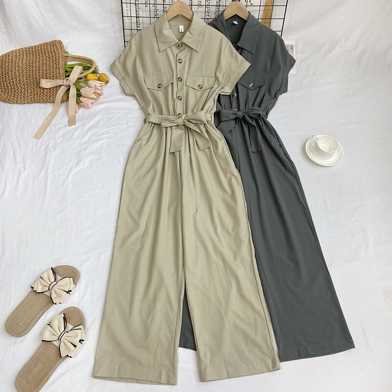 Nomikuma 夏因果ターンダウン襟シングルブレストスリムウエスト包帯カーゴワイドレッグジャンプスーツ長ズボン ロング サマー 夏物 ワイドパンツ