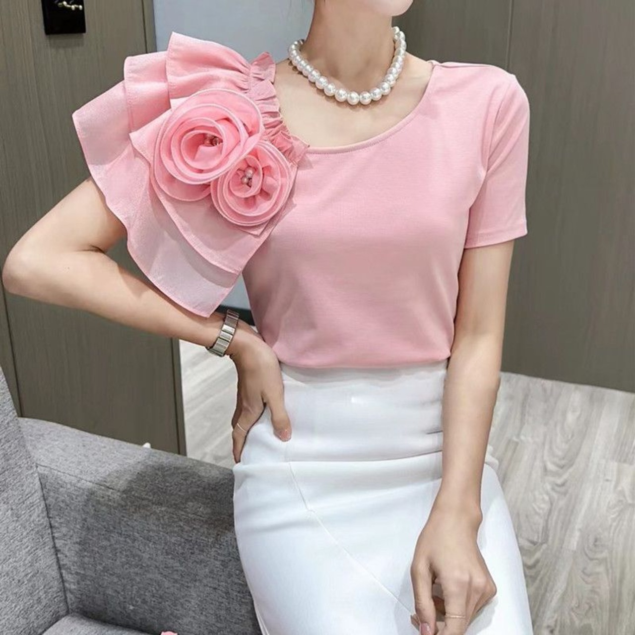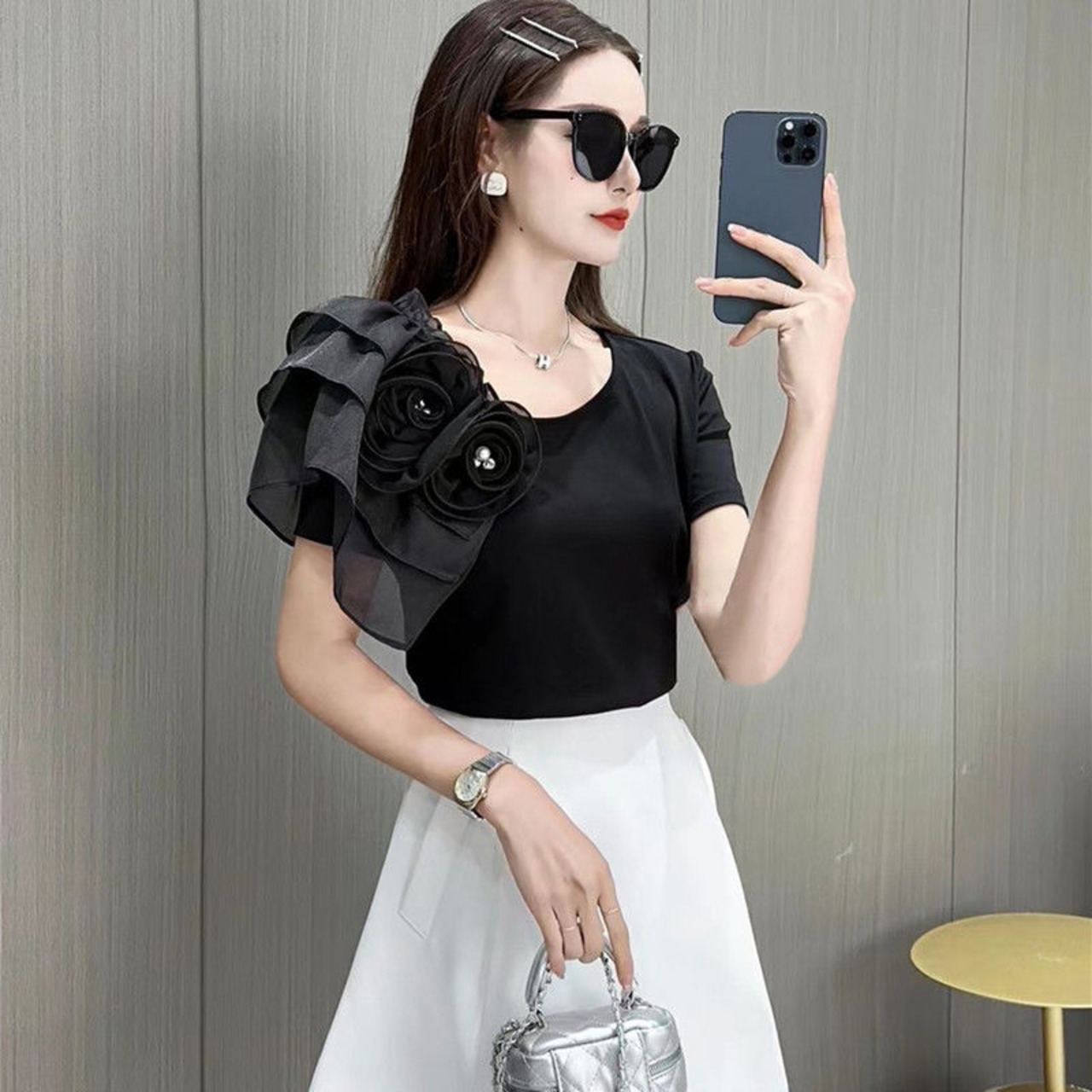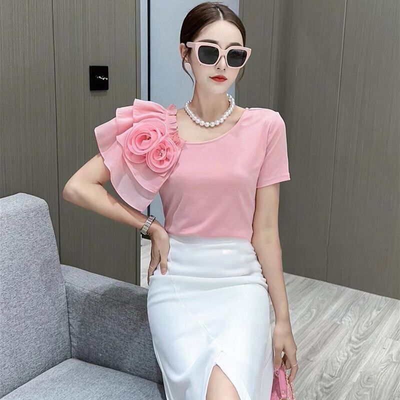 Nomikuma 半袖シャツ夏 3D フラワーグラフィック Tシャツスキューカラースタイル Y2k トップ ショート ハーフスリーブ サマー 夏物 フラワーデザイン