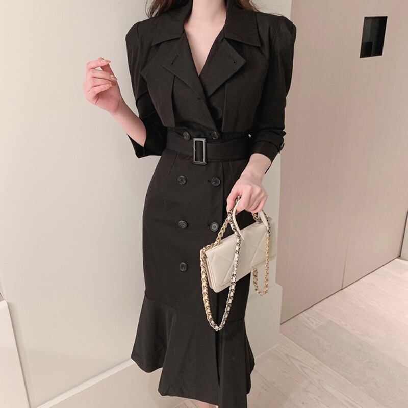 Nomikuma ダブルブレストマーメイドドレスベルトスリムウエストドレス秋長袖トランペット Vestidos ロング オータム 秋物 ハーネス