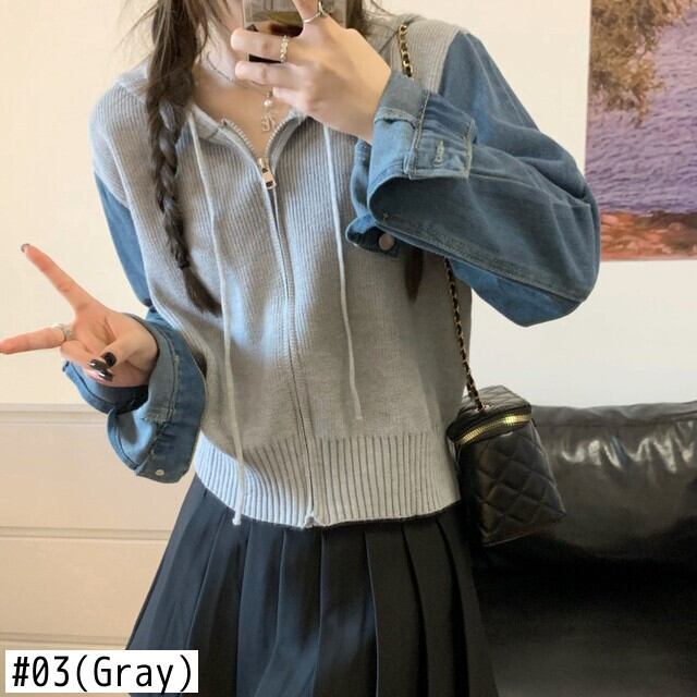 Nomikuma フード付きジッパーセーターコート秋冬デミンパッチワークスパイシーガール長袖ニットカーディガントップス ロング オータム 秋物 ウィンター 冬物