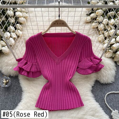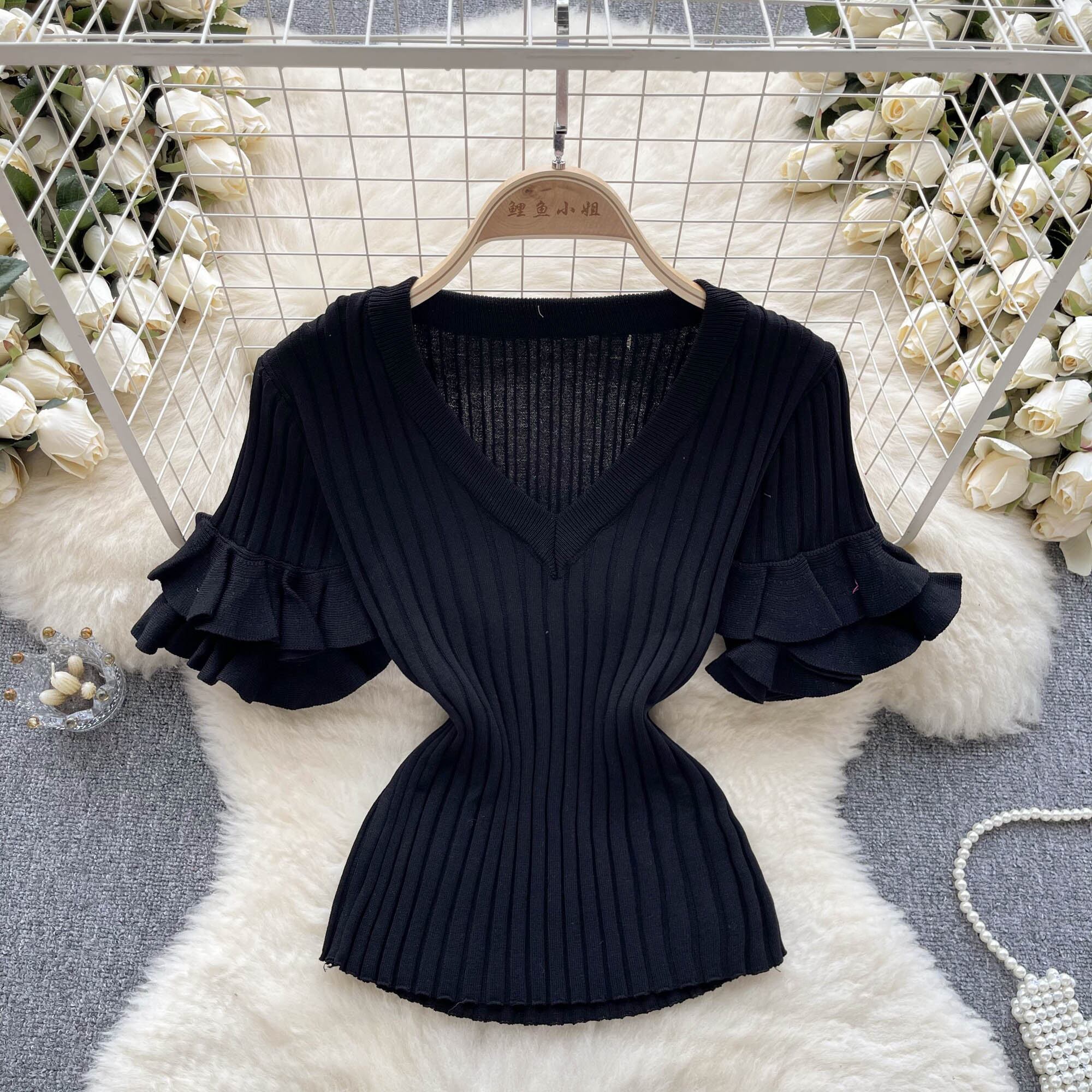 Nomikuma 夏フリルフレアスリーブ V ネックニットシャツセクシースリム弾性 Y2k トップ Caisal グラフィック Tシャツ エラスティック 伸縮 サマー 夏物 Vネック ソリッドカラー