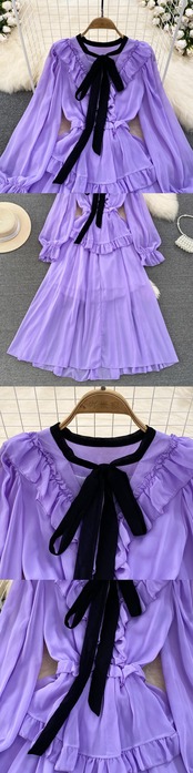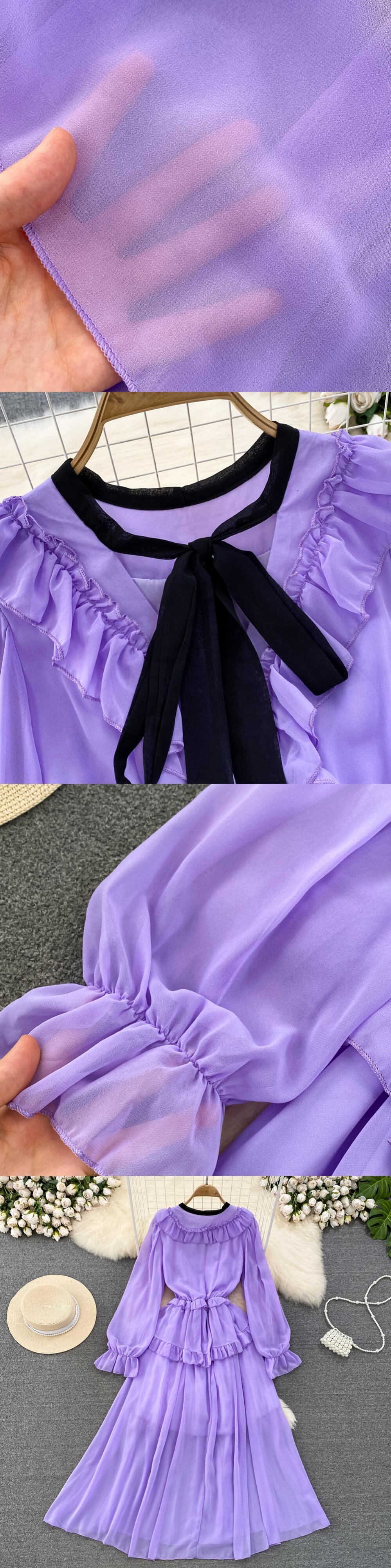 Nomikuma 長袖リボン包帯 V ネックドレスフリルスリムウエスト A ラインシフォンドレス Vestido ロング Vネック Aライン