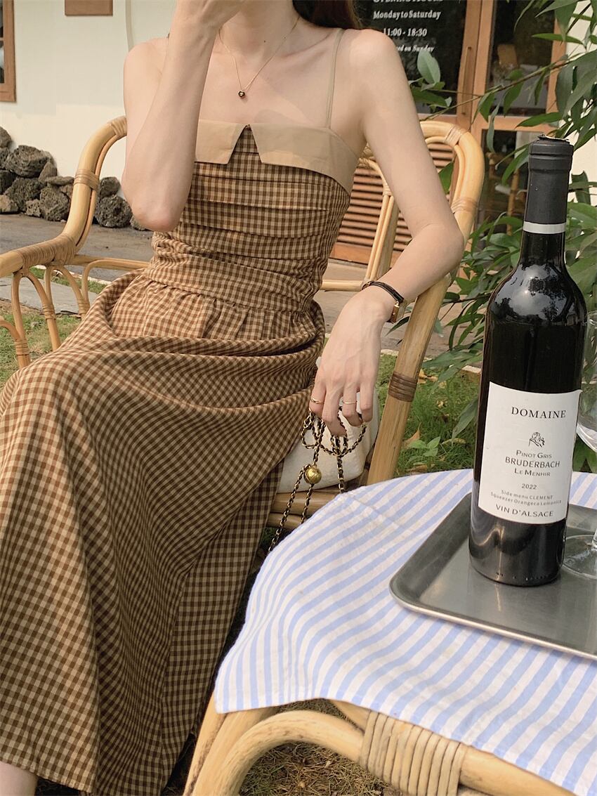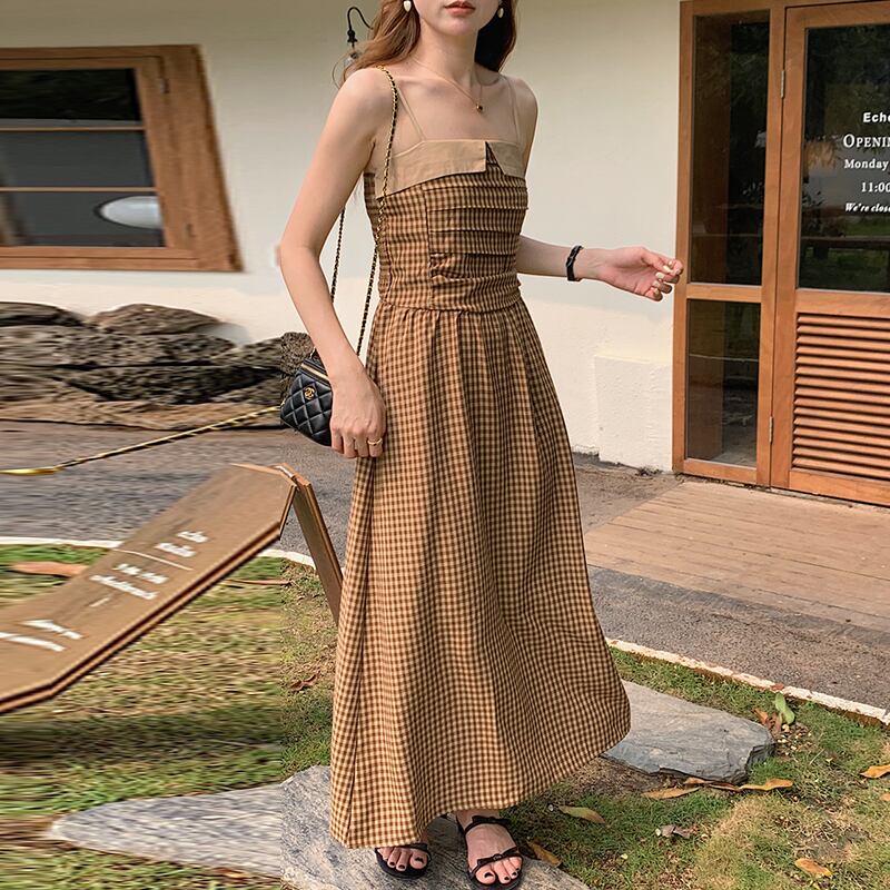 Nomikuma シック夏オフショルダーストラップレスウエストミッドレングスストラップドレスチェック柄ドレス サマー 夏物