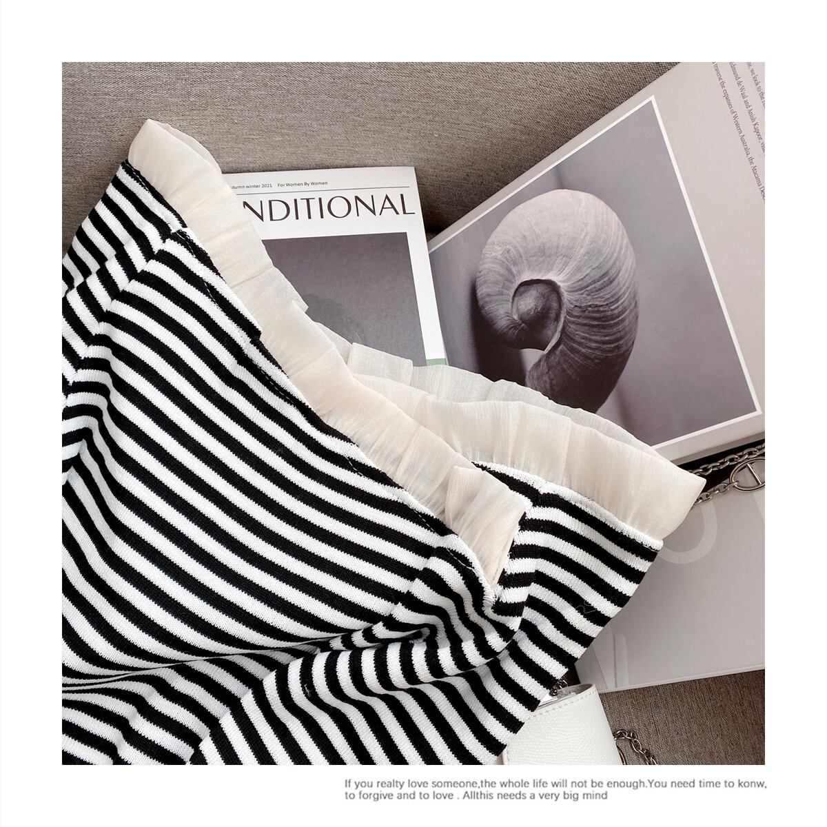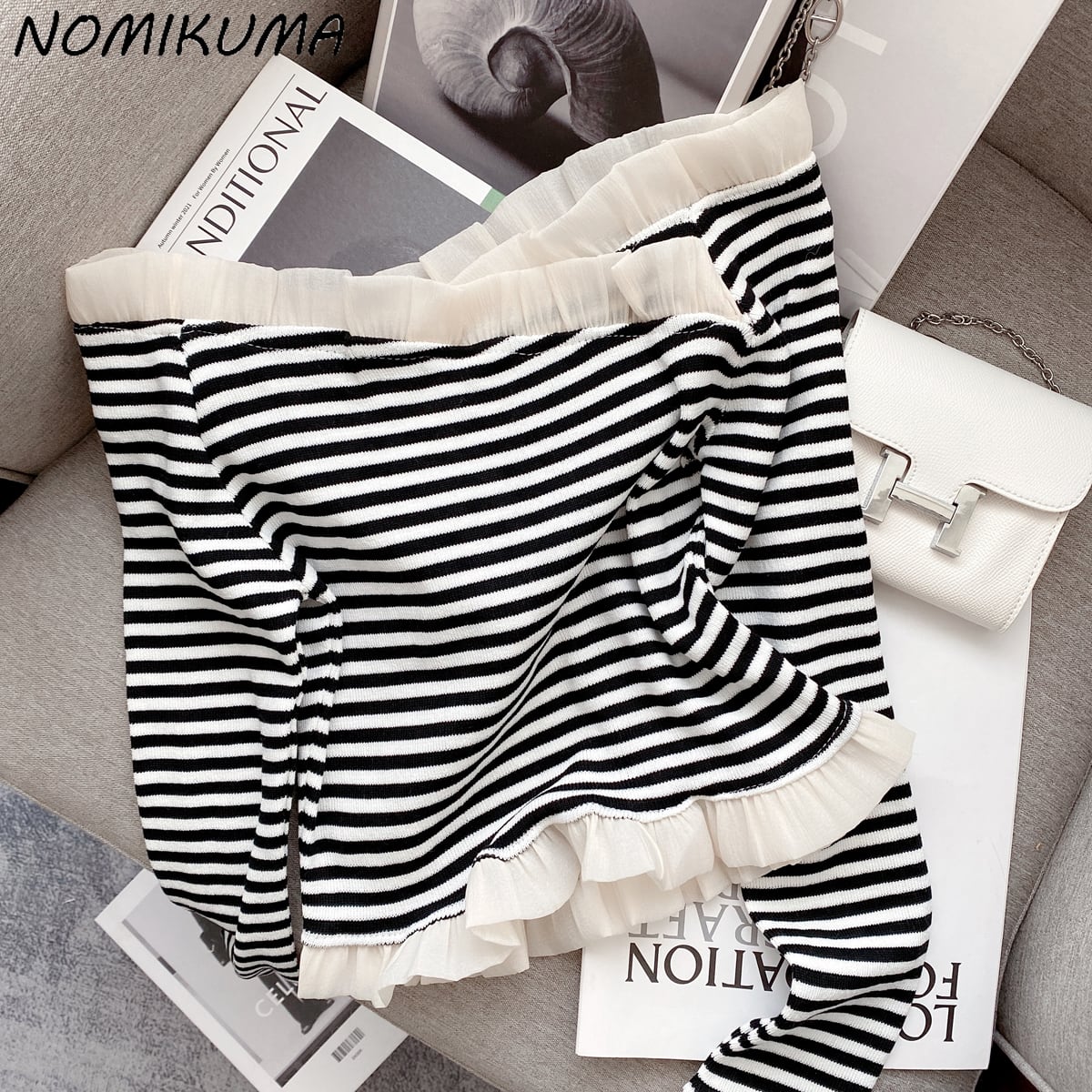 Nomikuma 秋オフショルダーストライプニットスリムショートトップシックフリルパッチワークセクシーストラップレス長袖ニットセーター ロング オータム 秋物