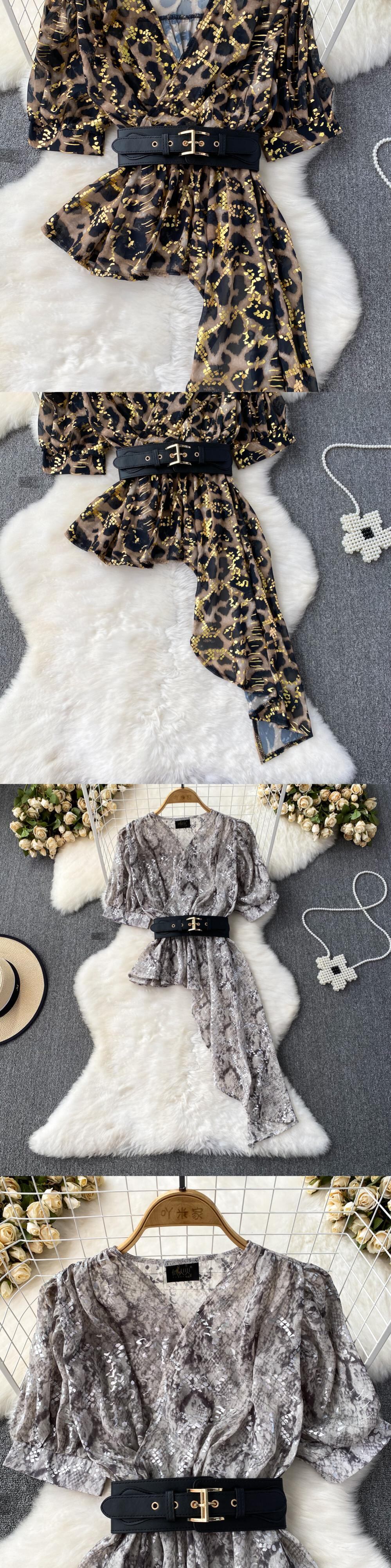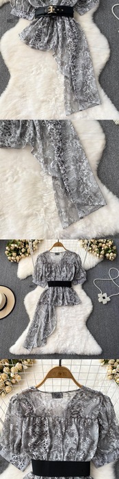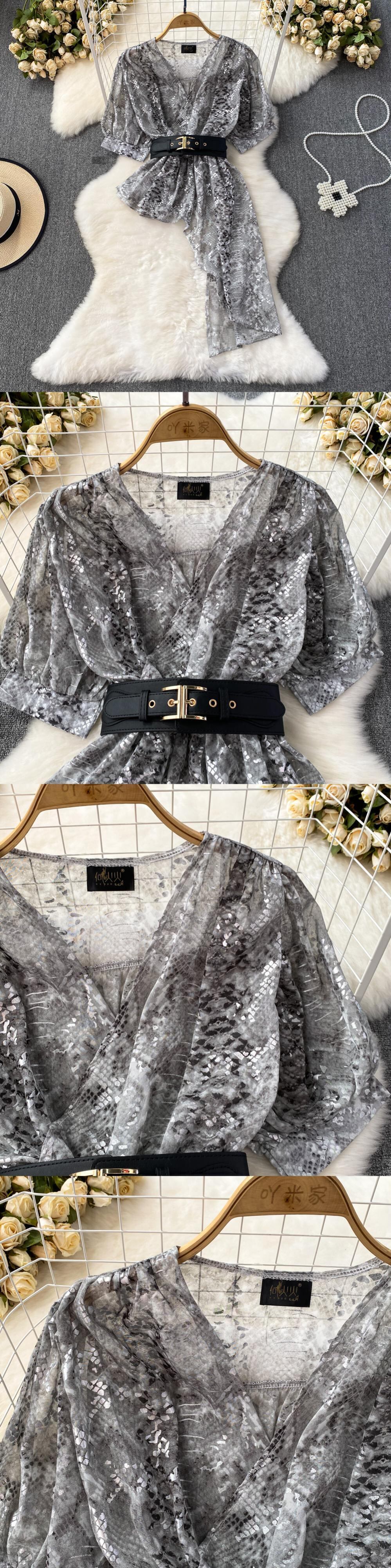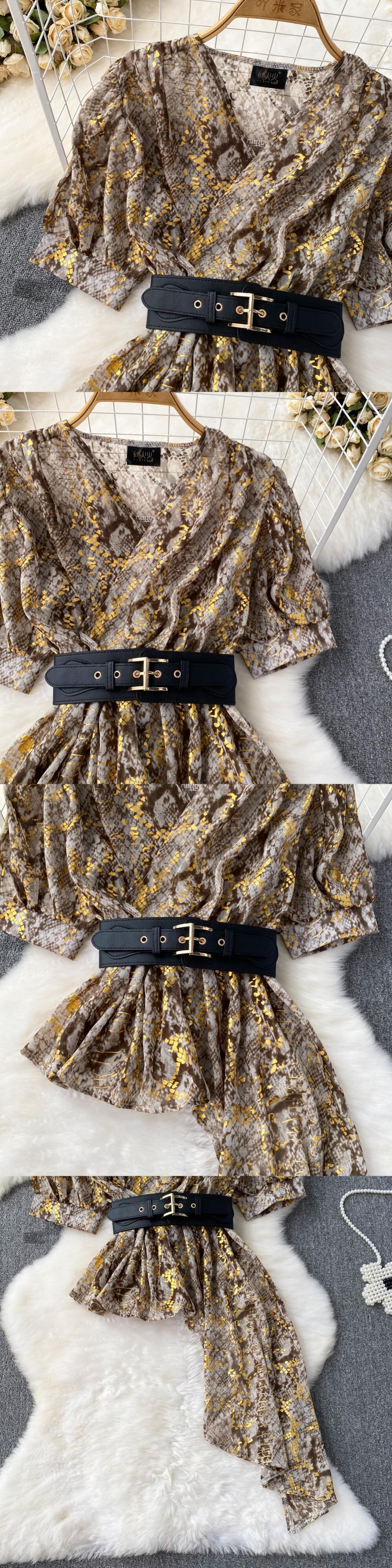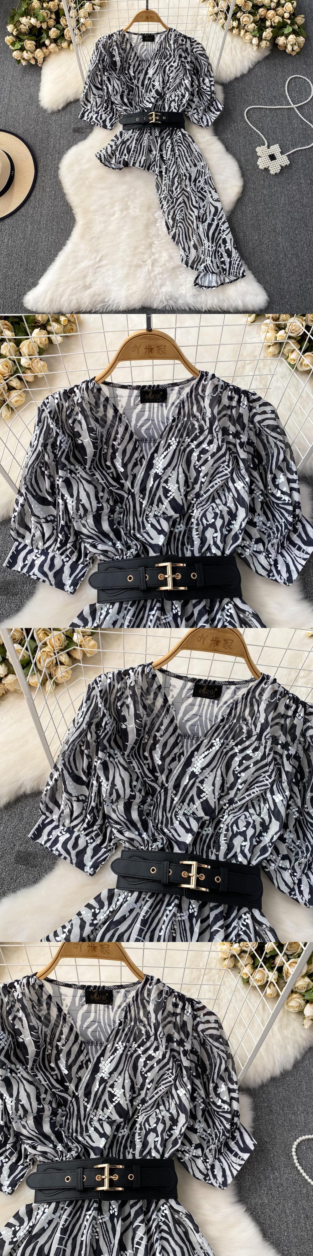 Nomikuma プリント V ネックベルトスリムウエストシフォンシャツ不規則因果トップス夏半袖ブラウス ショート ハーフスリーブ サマー 夏物 ハーネス Vネック