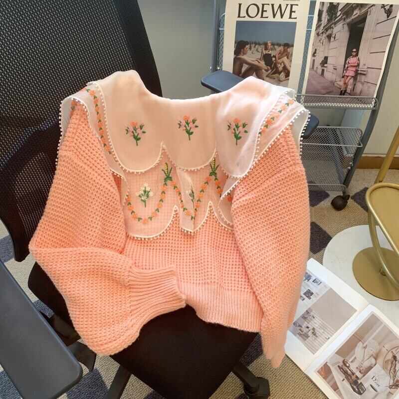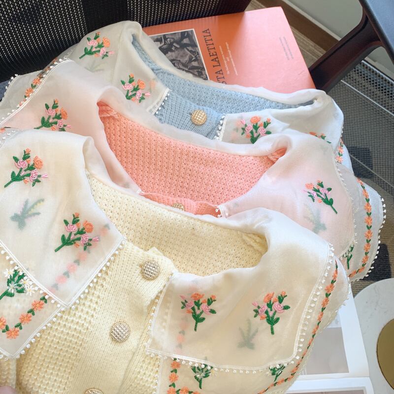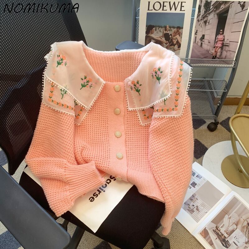Nomikuma 花柄ピーターパンカラーパッチワークニットカーディガン Koean シック甘いショートセーター秋コート 大人ガーリー スウィート キュート カジュアル オータム 秋物