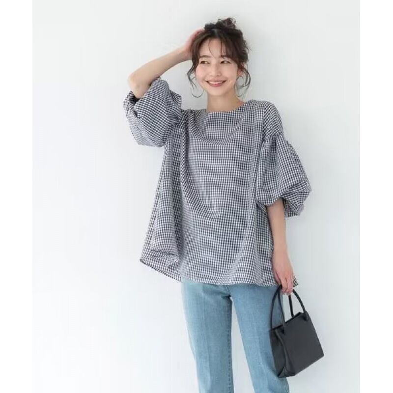 Nomikuma 夏甘いチェック柄ドールシャツシックランタンスリーブブラウスレースアップ O ネックレディーストップス因果デ 大人ガーリー スウィート キュート カジュアル サマー 夏物 Oネック