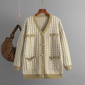 Nomikuma セーター因果 V ネック鳥格子長袖ニットカーディガンコートヒットカラーニットトップス ロング Vネック