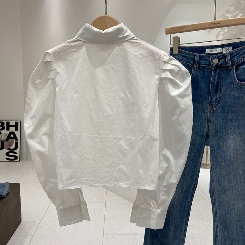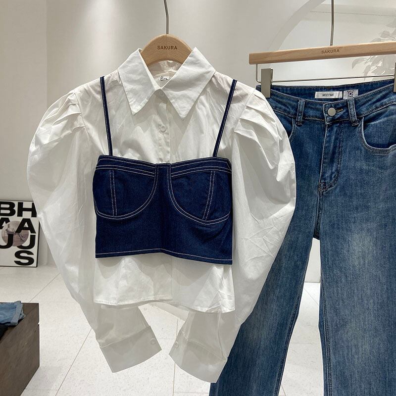 Nomikuma 秋デミンスリングベスト因果パフスリーブターンダウンカラーブラウス 2 枚トップセット オータム 秋物