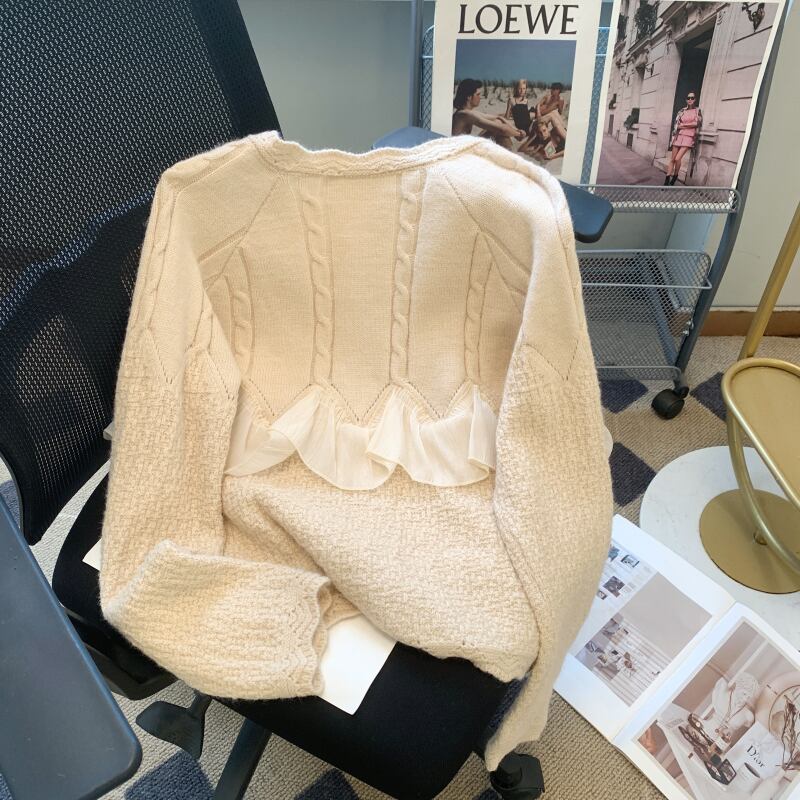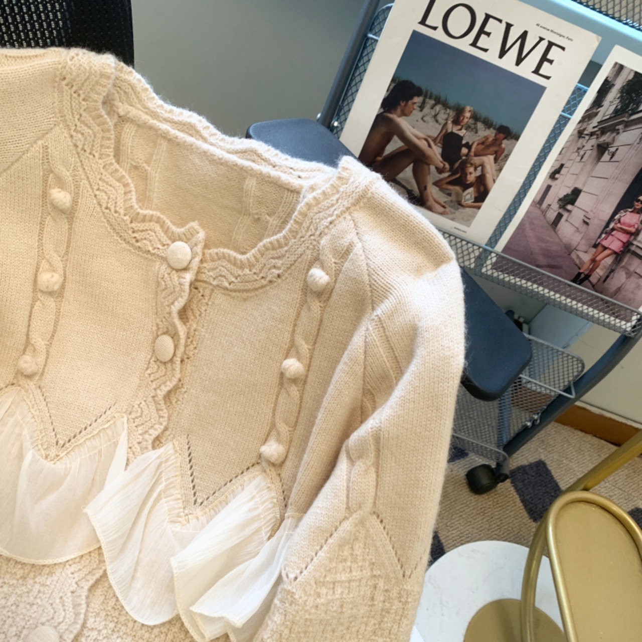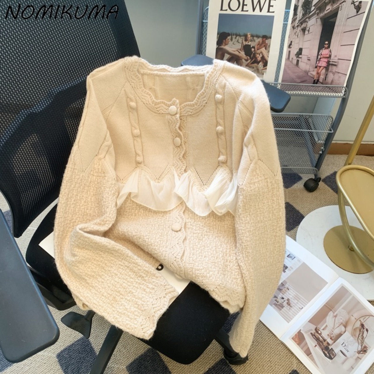 Nomikuma 因果フリル甘いパッチワークセーターニットカーディガン秋シックニットウェアコートトップス 大人ガーリー スウィート キュート カジュアル オータム 秋物