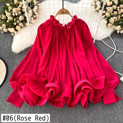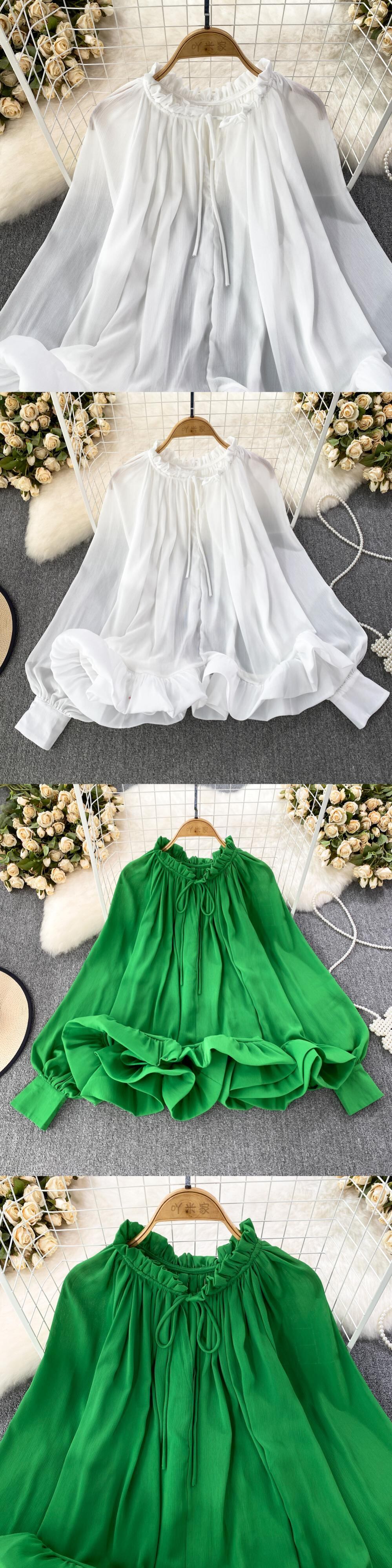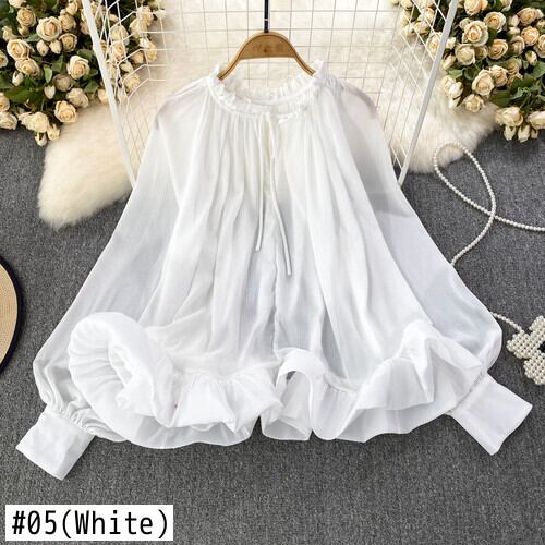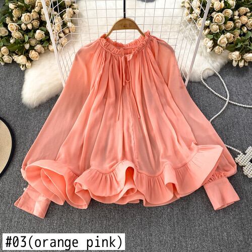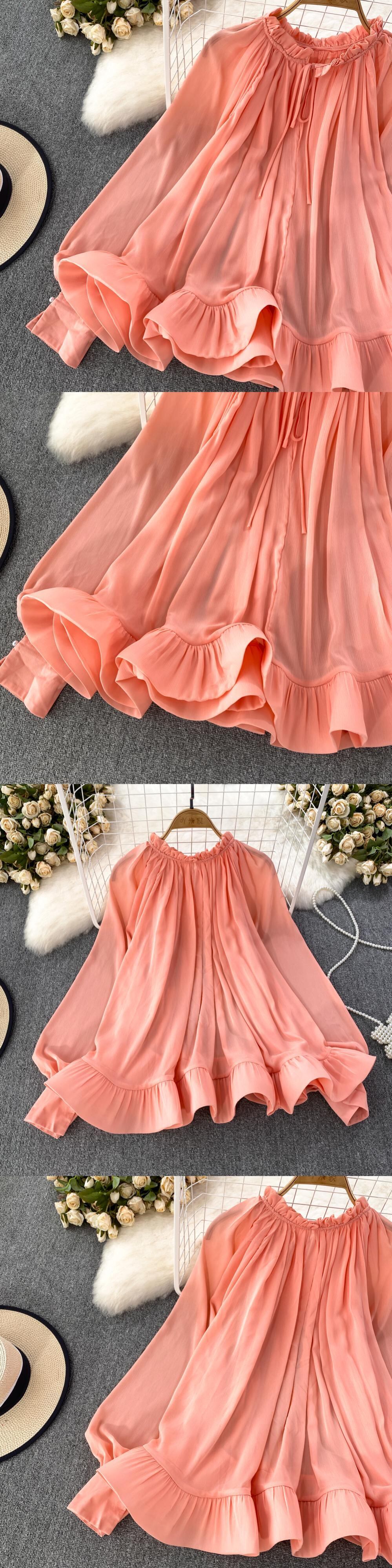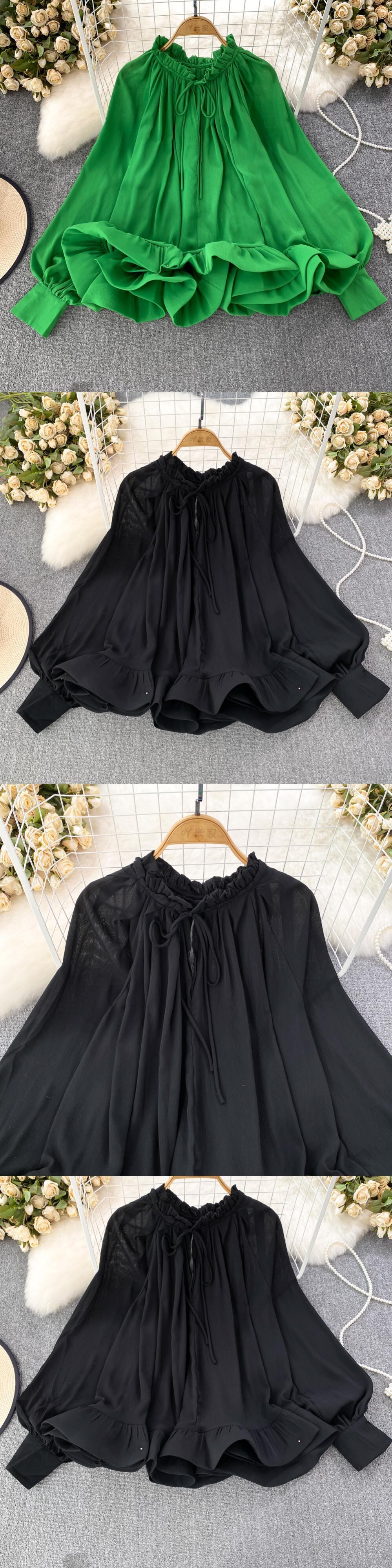 Nomikuma 秋ランタン長袖ブラウス因果レースアップ O ネックシャツシックフリル甘いトップス ロング 大人ガーリー スウィート キュート カジュアル オータム 秋物 Oネック