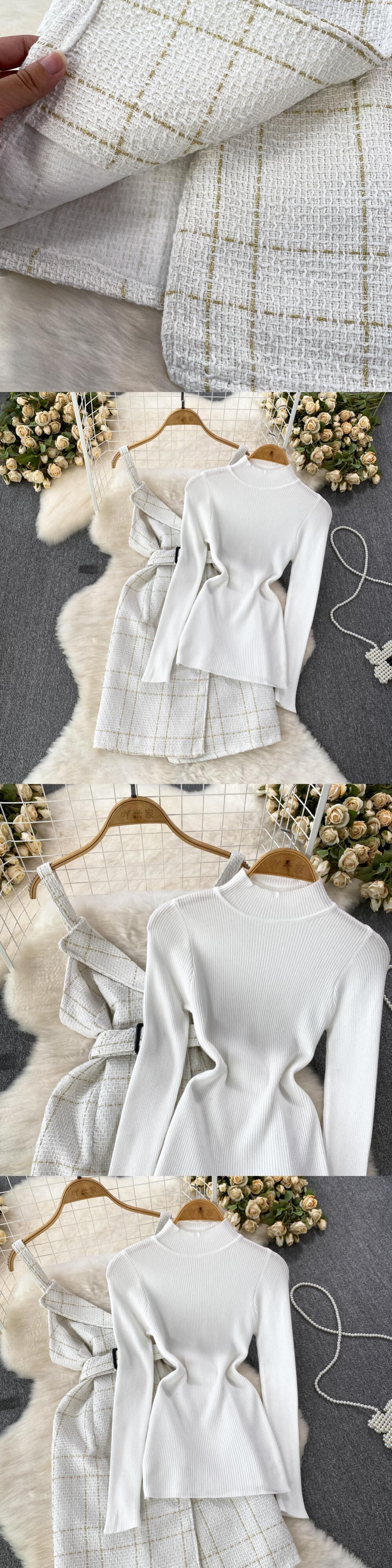 Nomikuma レディース セット ミディアム丈 A ライン ツイード チェック柄 ストラップ ドレス ツーピース + ベース ニット シャツ 秋服 オータム 秋物 Aライン