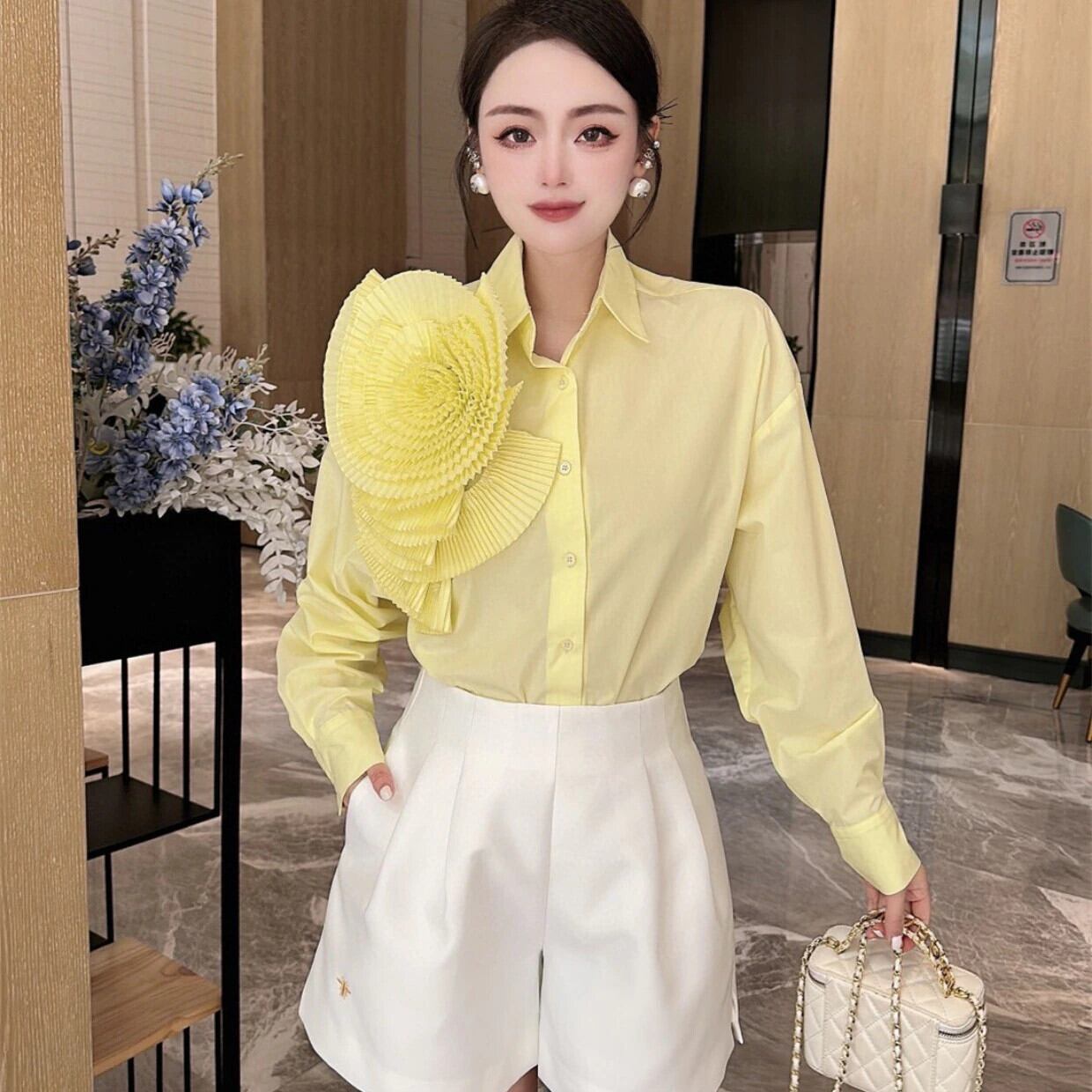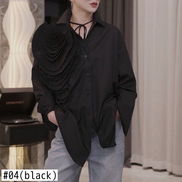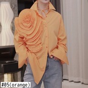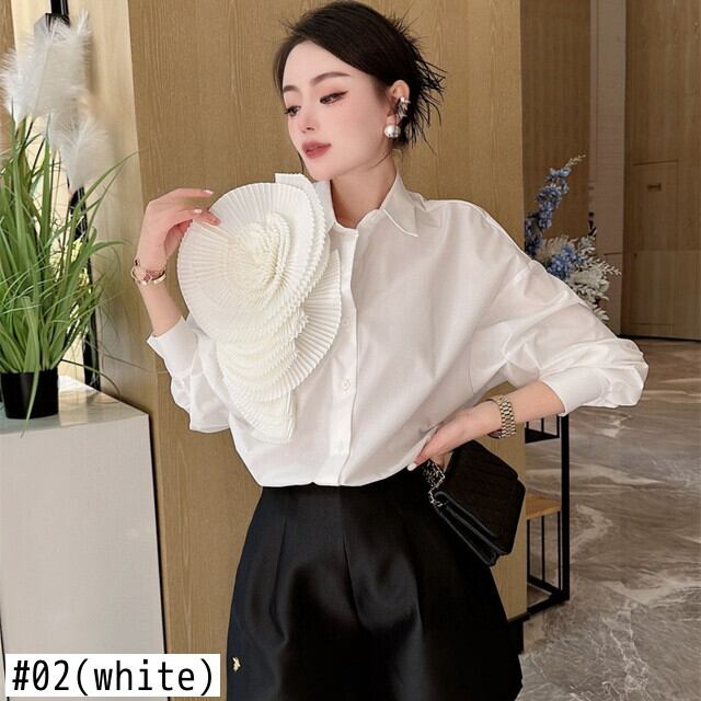 Nomikuma 3D フラワー長袖ブラウスシャツカジュアルターンダウンカラートップスデ ロング フラワーデザイン