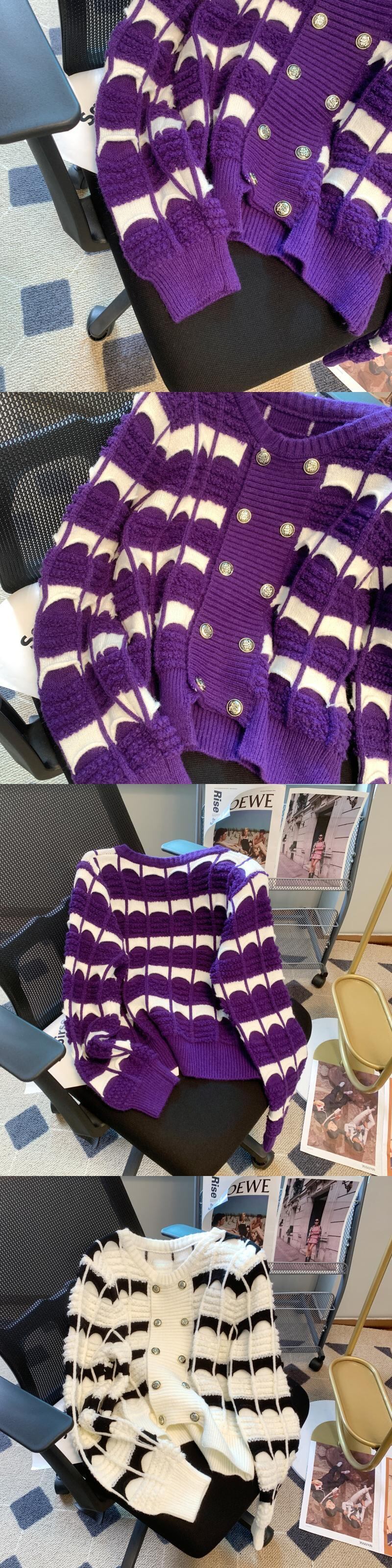 Nomikuma ストライプ ニット カーディガン レディース 秋冬 パフ スリーブ セーター コート ダブルブレスト ニット トップ オータム 秋物 ウィンター 冬物