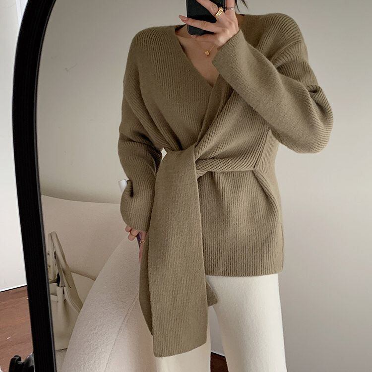 Nomikuma 秋冬包帯スリムウエストニットセーター長袖 V ネックニットトップスセーター ロング オータム 秋物 ウィンター 冬物 Vネック