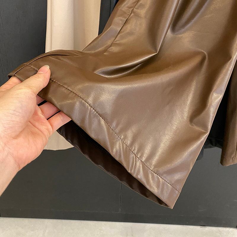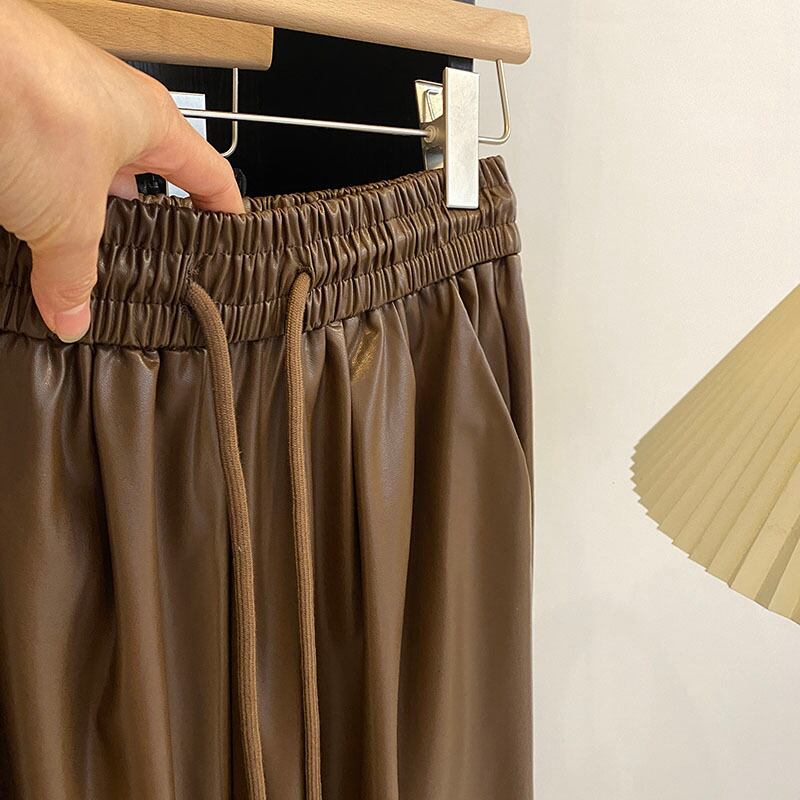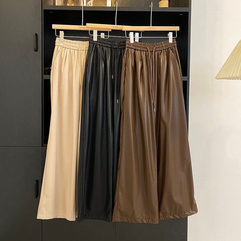 Nomikuma レースアップ弾性ウエストレザーパンツ秋 Kroean 長ズボン因果 PU ワイドレッグパンツ ロング エラスティック 伸縮 オータム 秋物 ワイドパンツ
