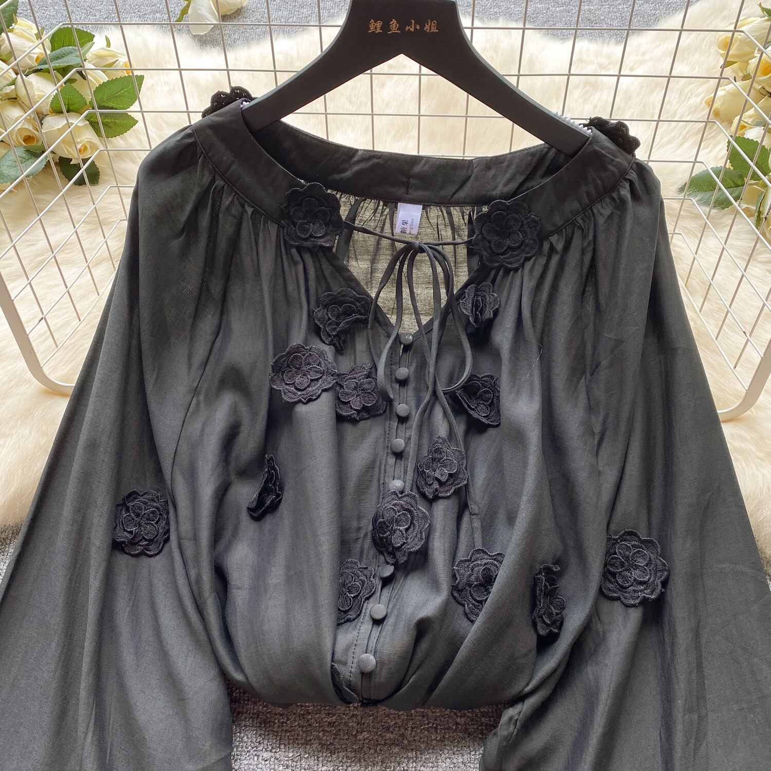 Nomikuma 甘い 3D 花レースアップランタンスリーブ秋シャツ因果トップスシックブラウス 大人ガーリー スウィート キュート カジュアル オータム 秋物 フラワーデザイン