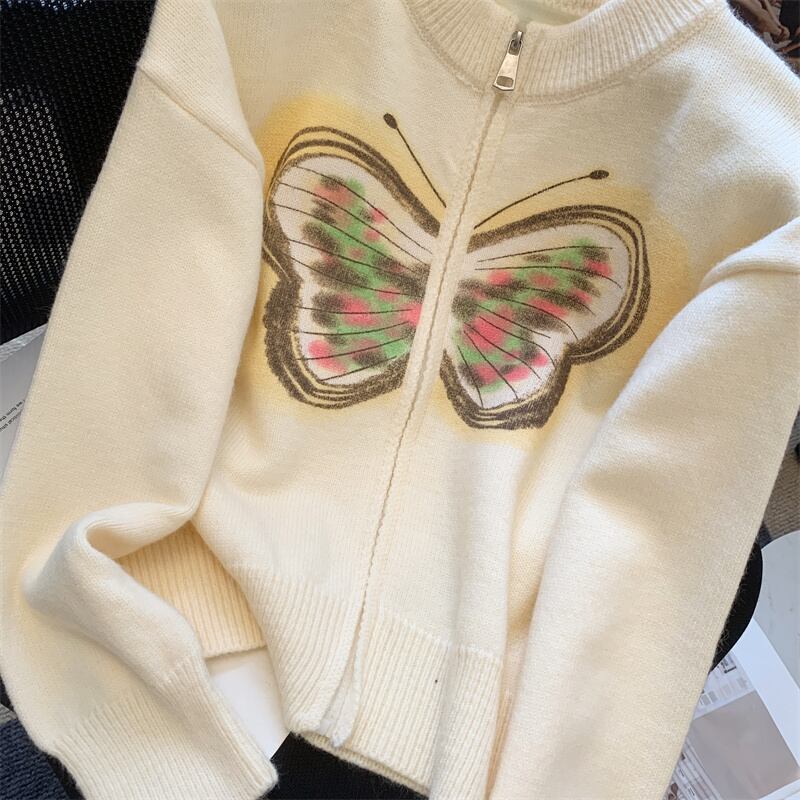 Nomikuma 蝶プリントニットカーディガンショートセーターコート因果長袖ジッパー半襟ニット ロング