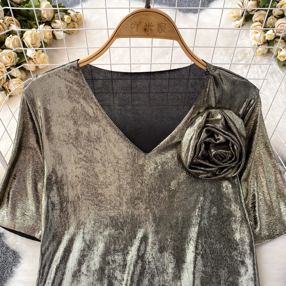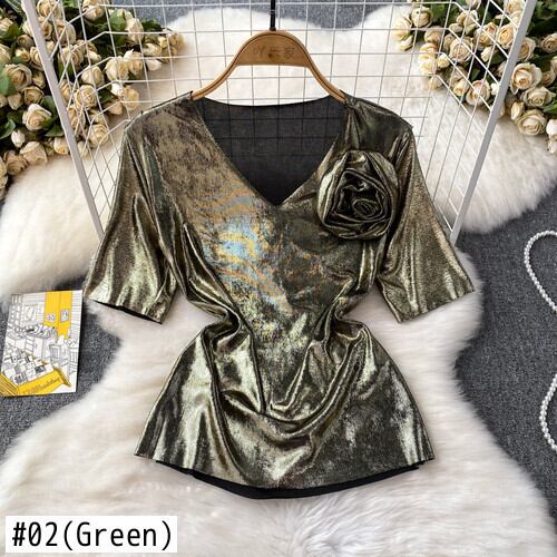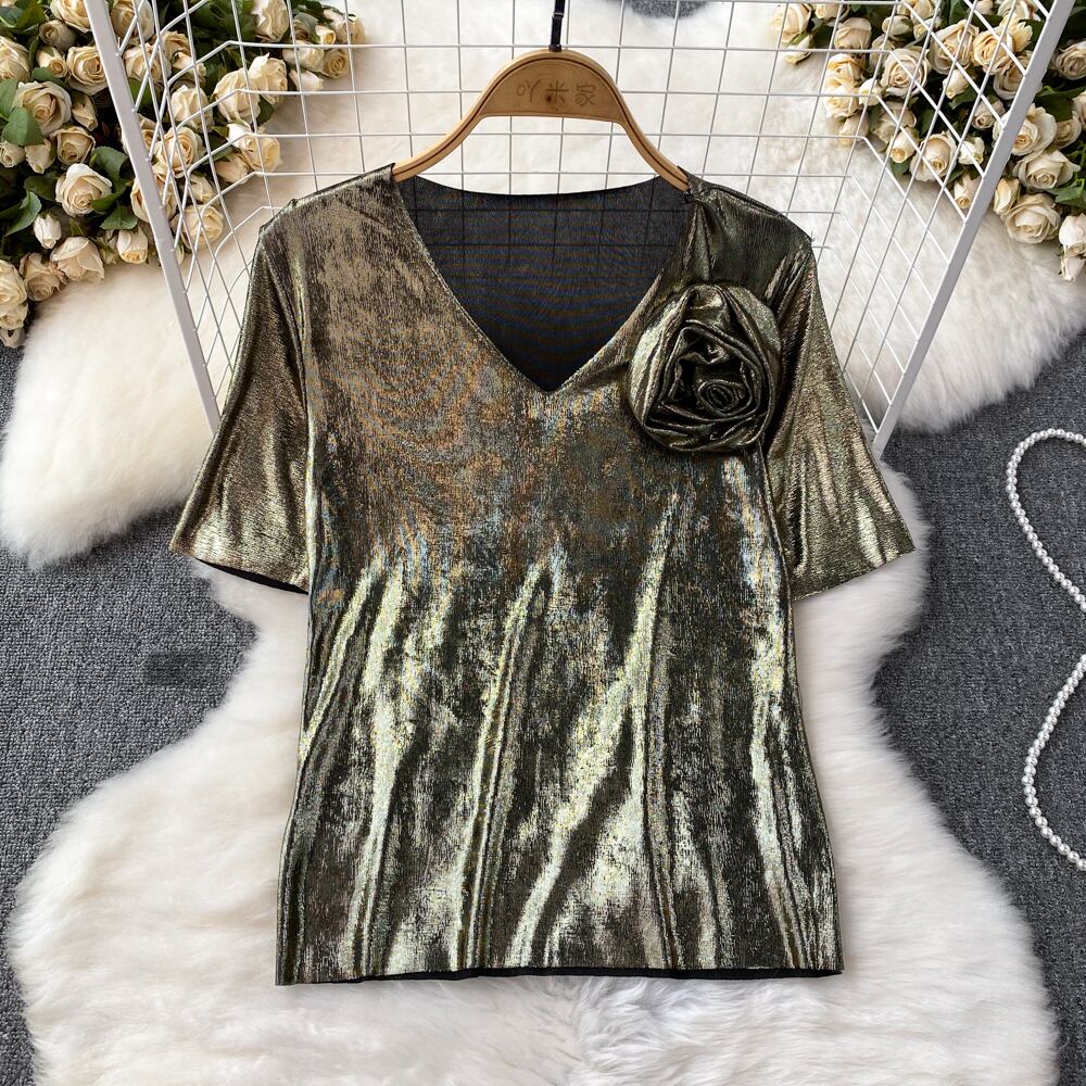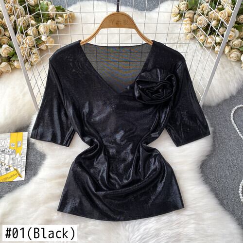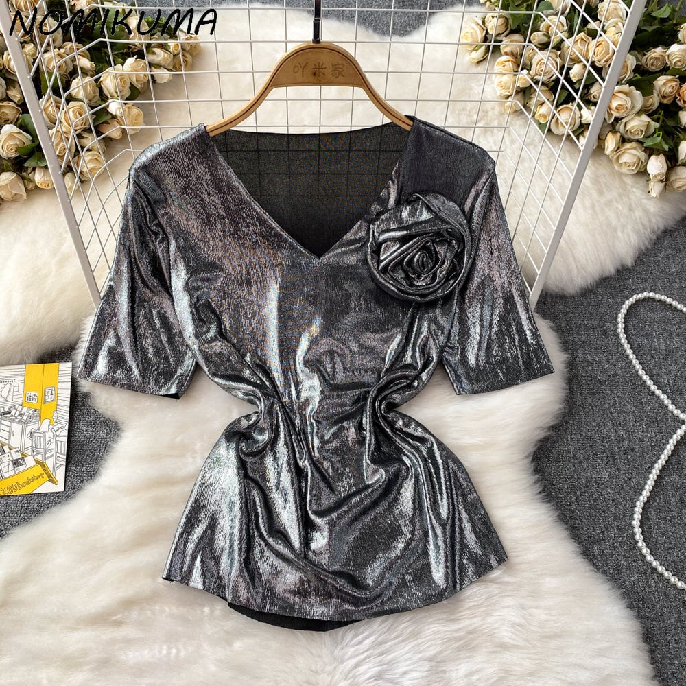 Nomikuma 夏半袖 3D フラワー V ネックスリムグラフィック Tシャツストリート原宿 Y2k トップ ショート ハーフスリーブ かわいい サマー 夏物 Vネック フラワーデザイン