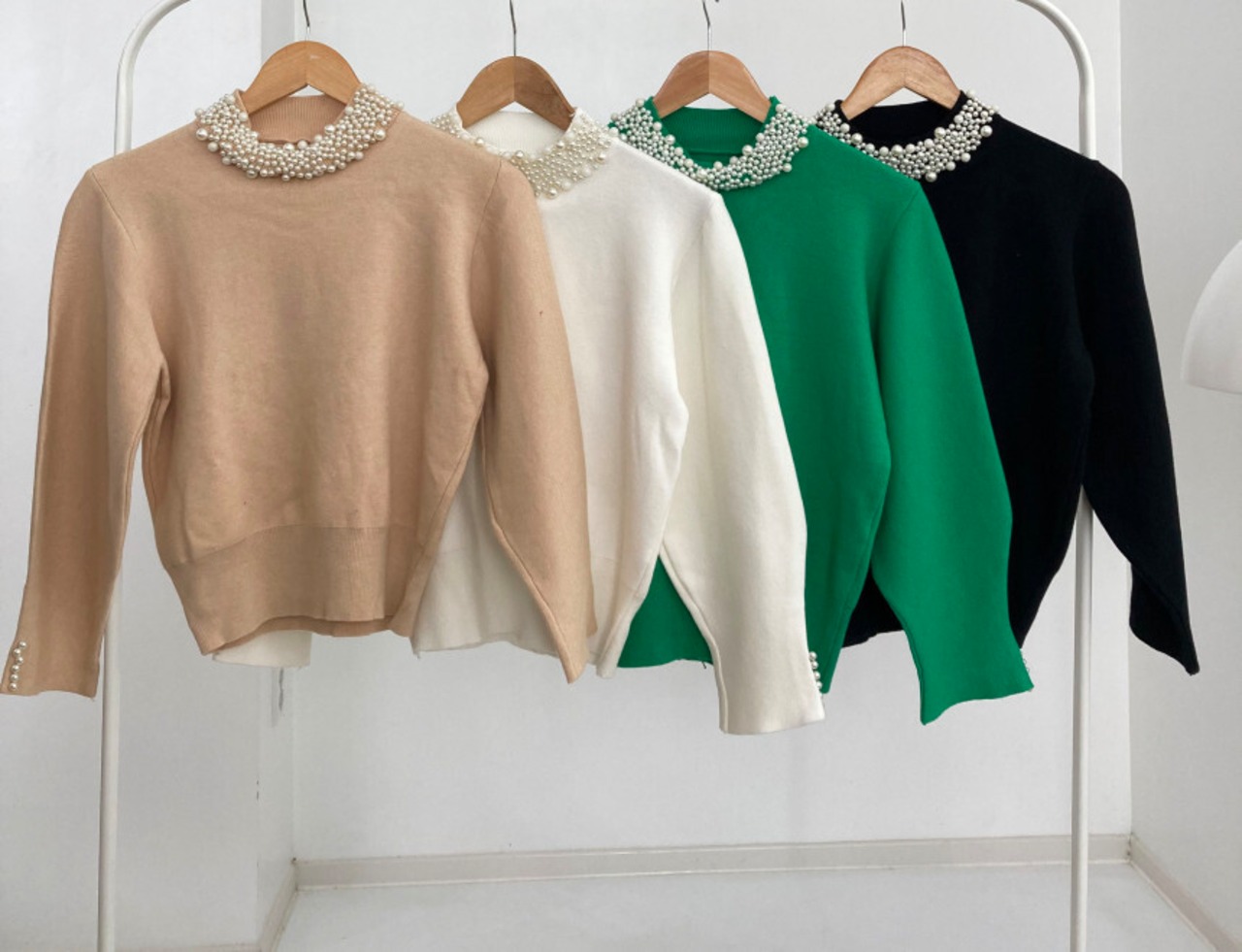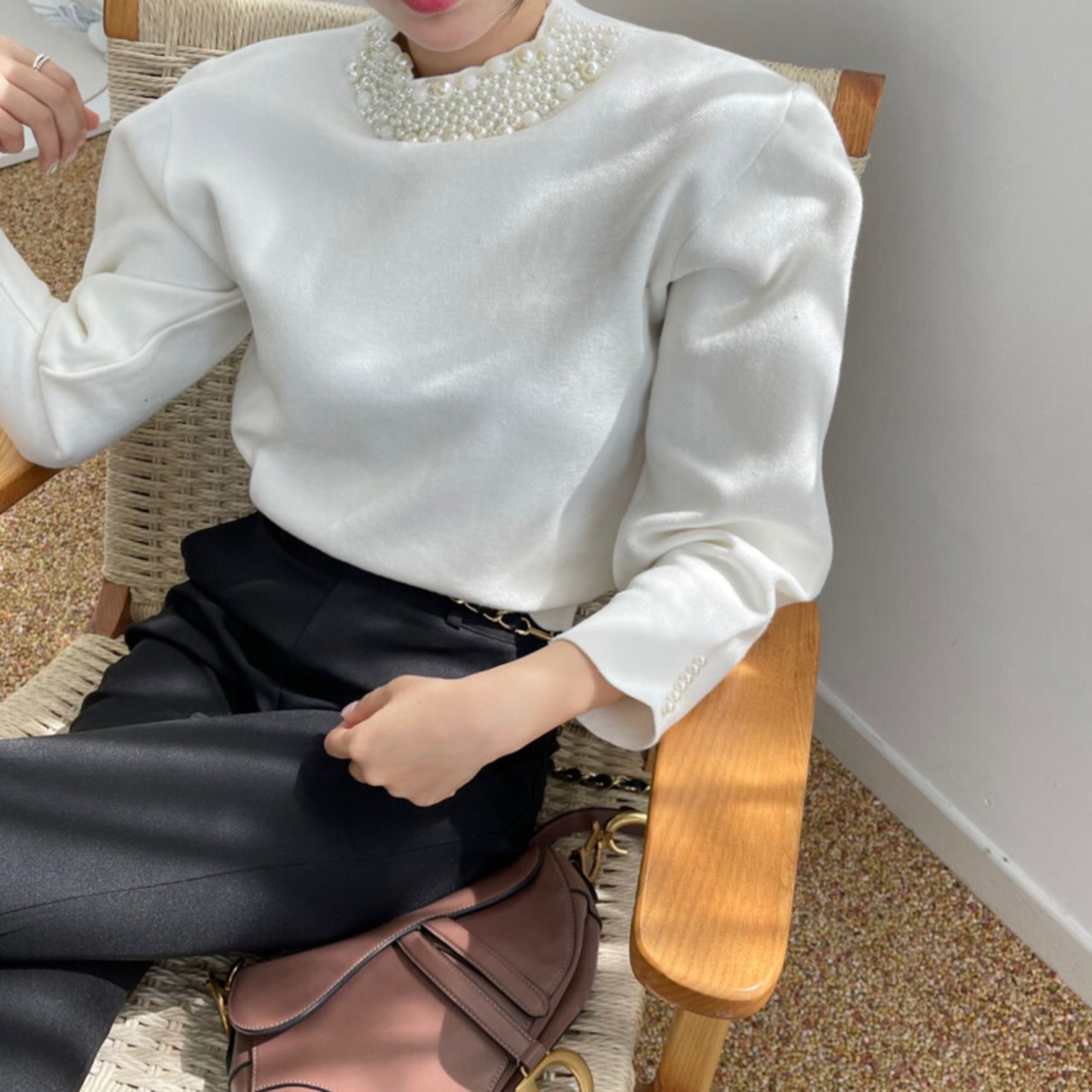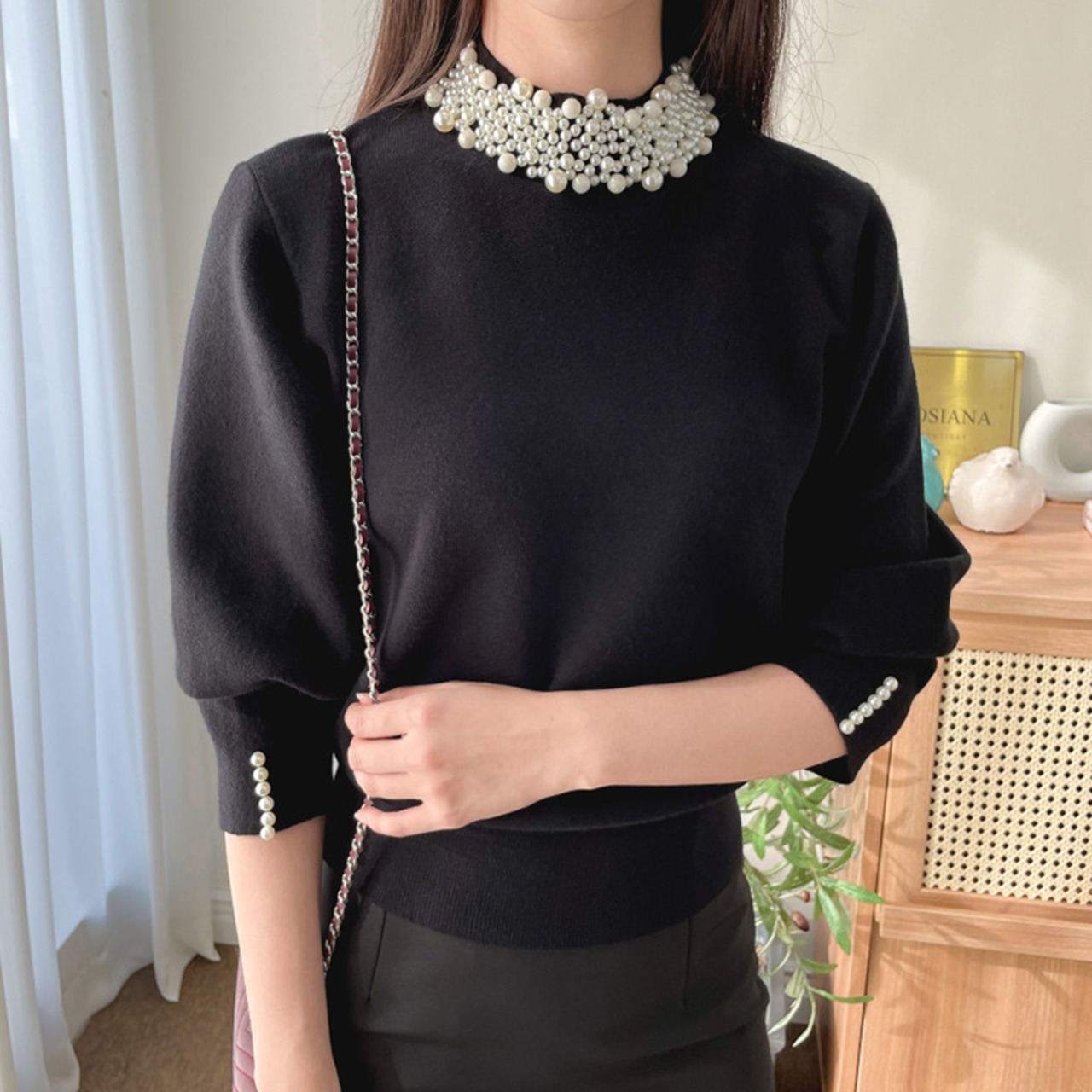 Nomikuma シック秋ビーズ半襟長袖セーター無地プルオーバーニットトップス ロング オータム 秋物 ソリッドカラー