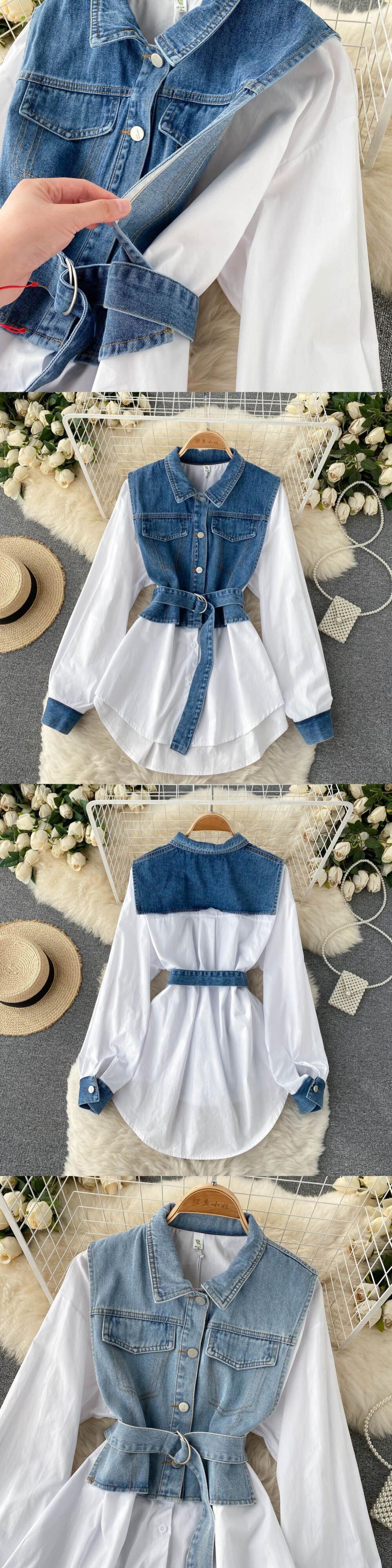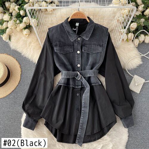 Nomikuma コーザルターンダウンカラーデミンフェイクツーピース長袖ブラウスミディアムロングスリムウエストシックシャツ