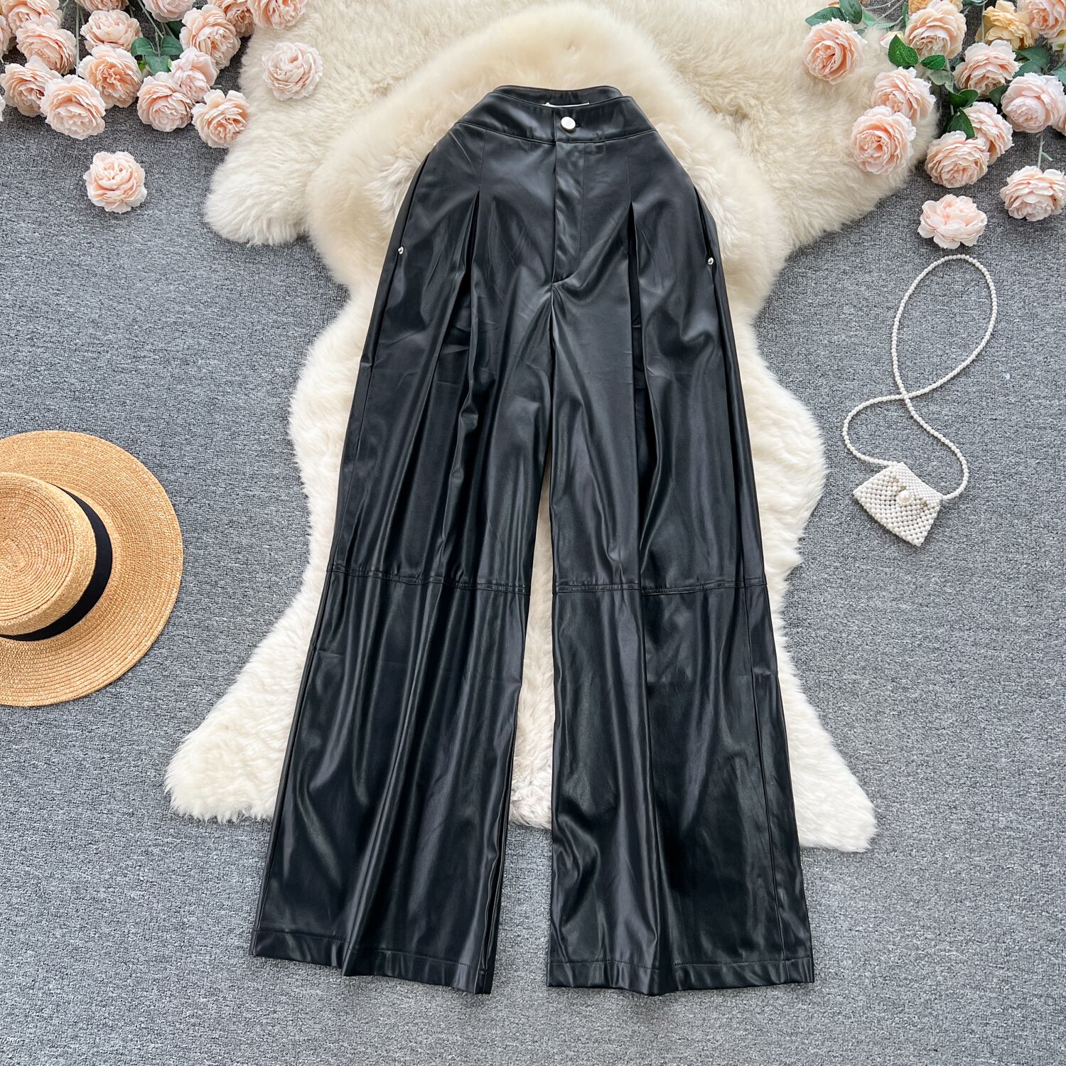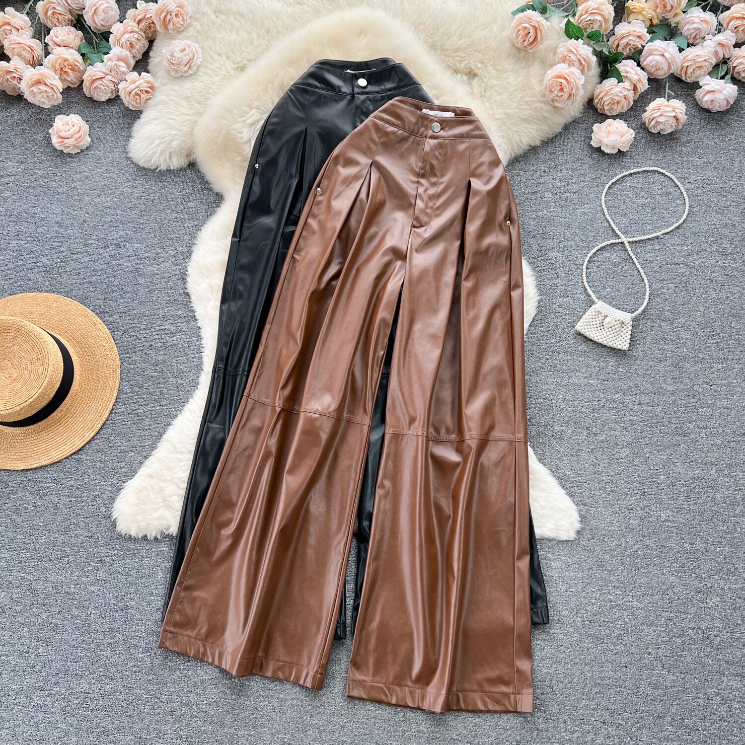 Nomikuma ワイドレッグパンツ秋冬レザーウエスト PU 長ズボン Pantalones ロング オータム 秋物 ウィンター 冬物 ワイドパンツ