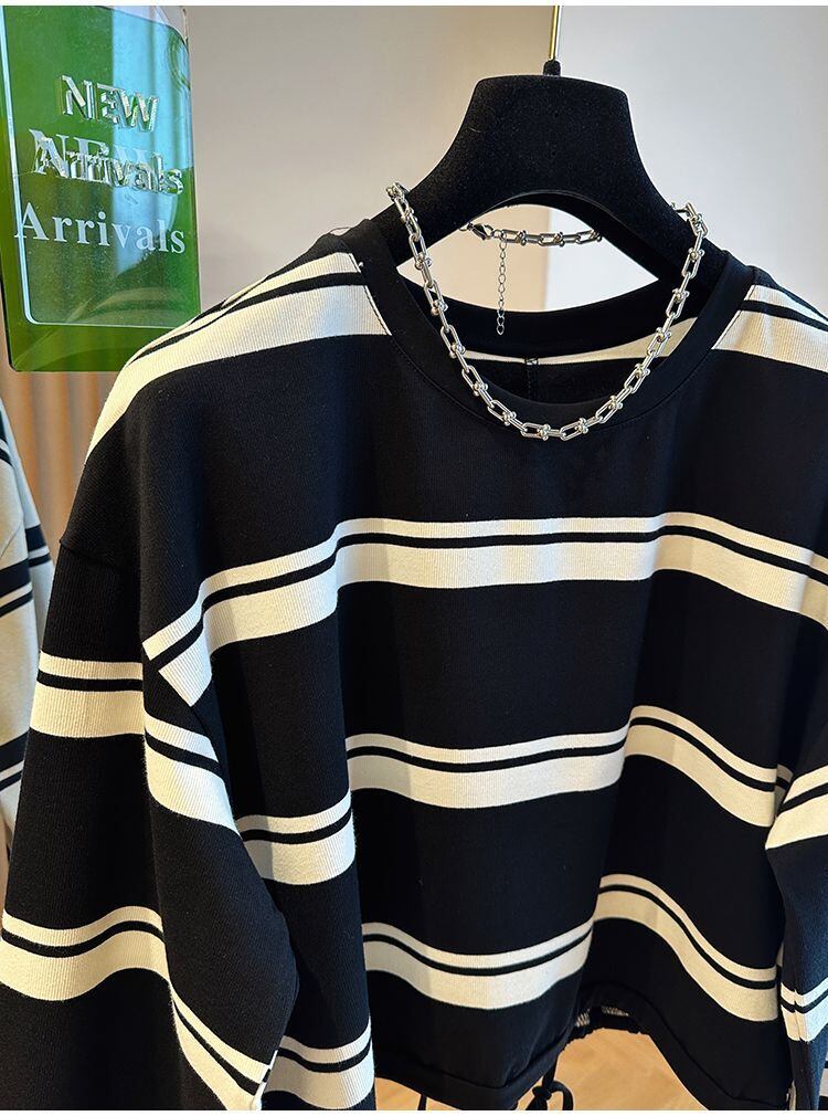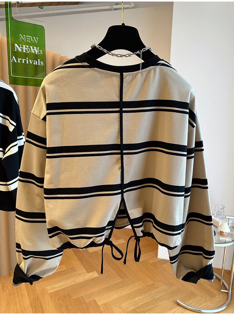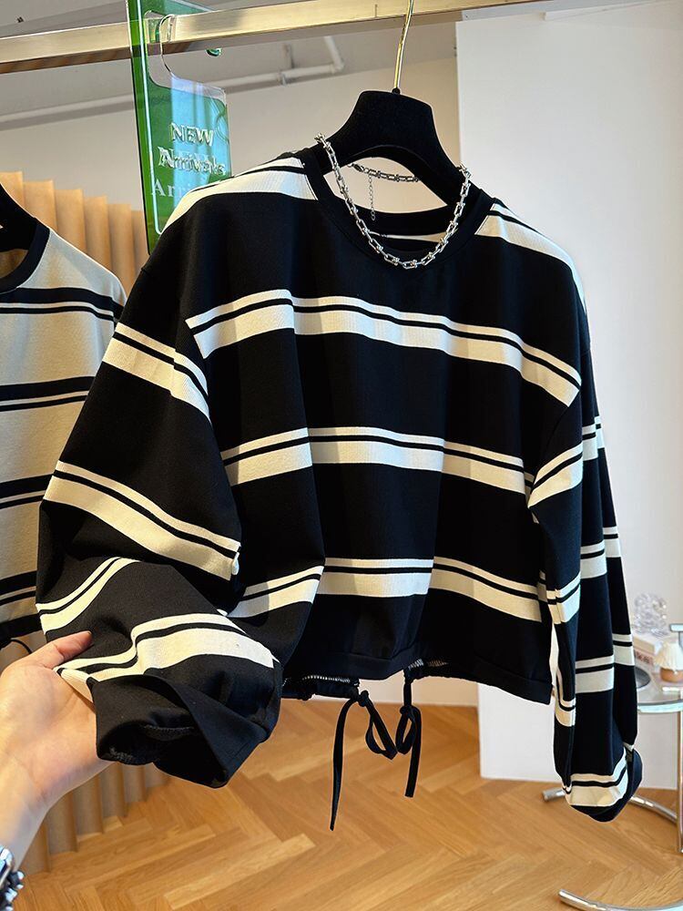 Nomikuma 秋ヒットカラーストライプパーカー因果長袖 O ネックトレーナー巾着ショートジャンパー ロング オータム 秋物 Oネック