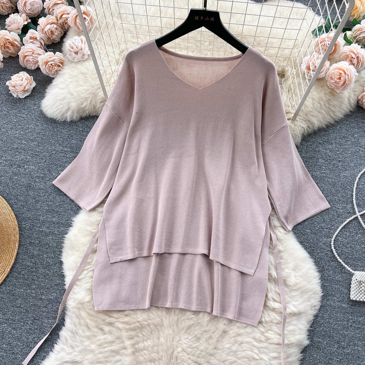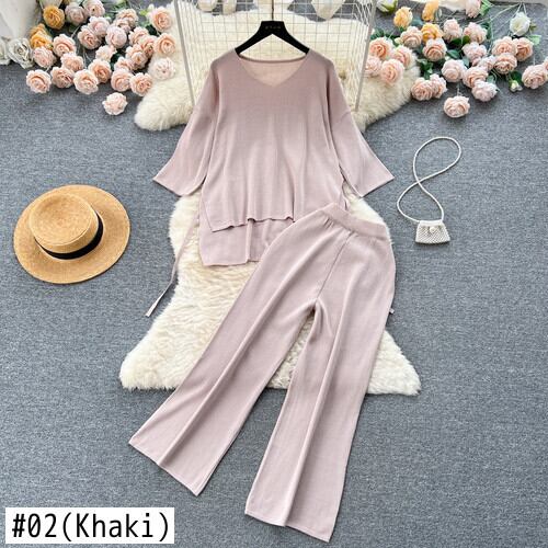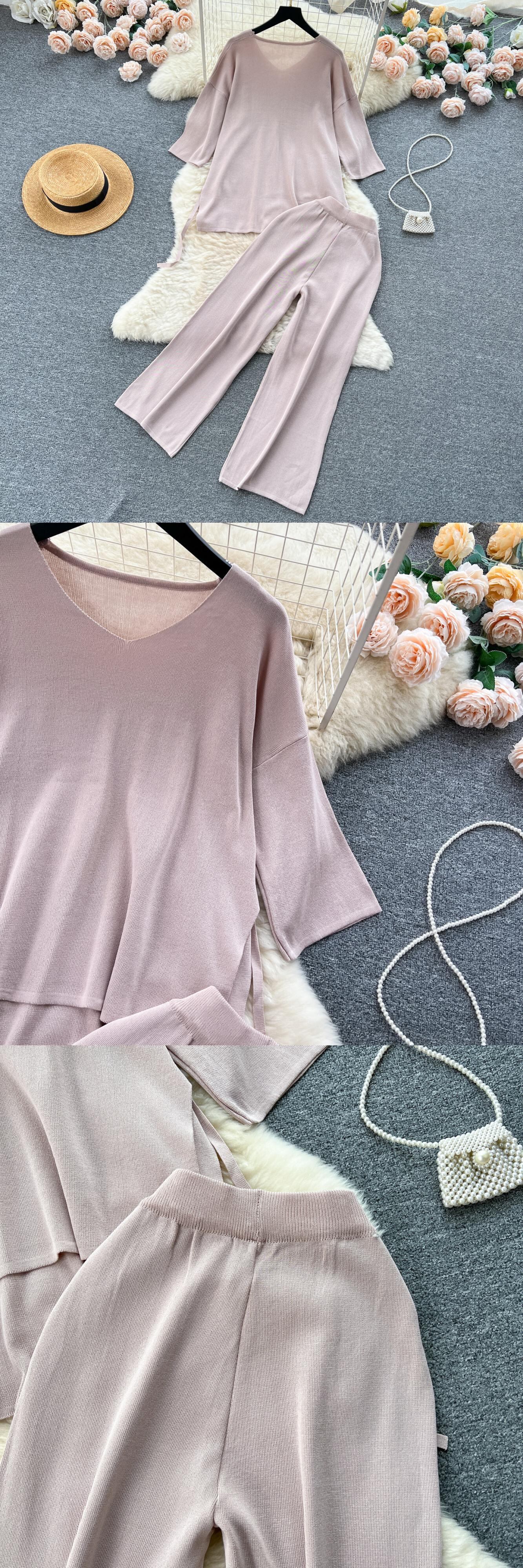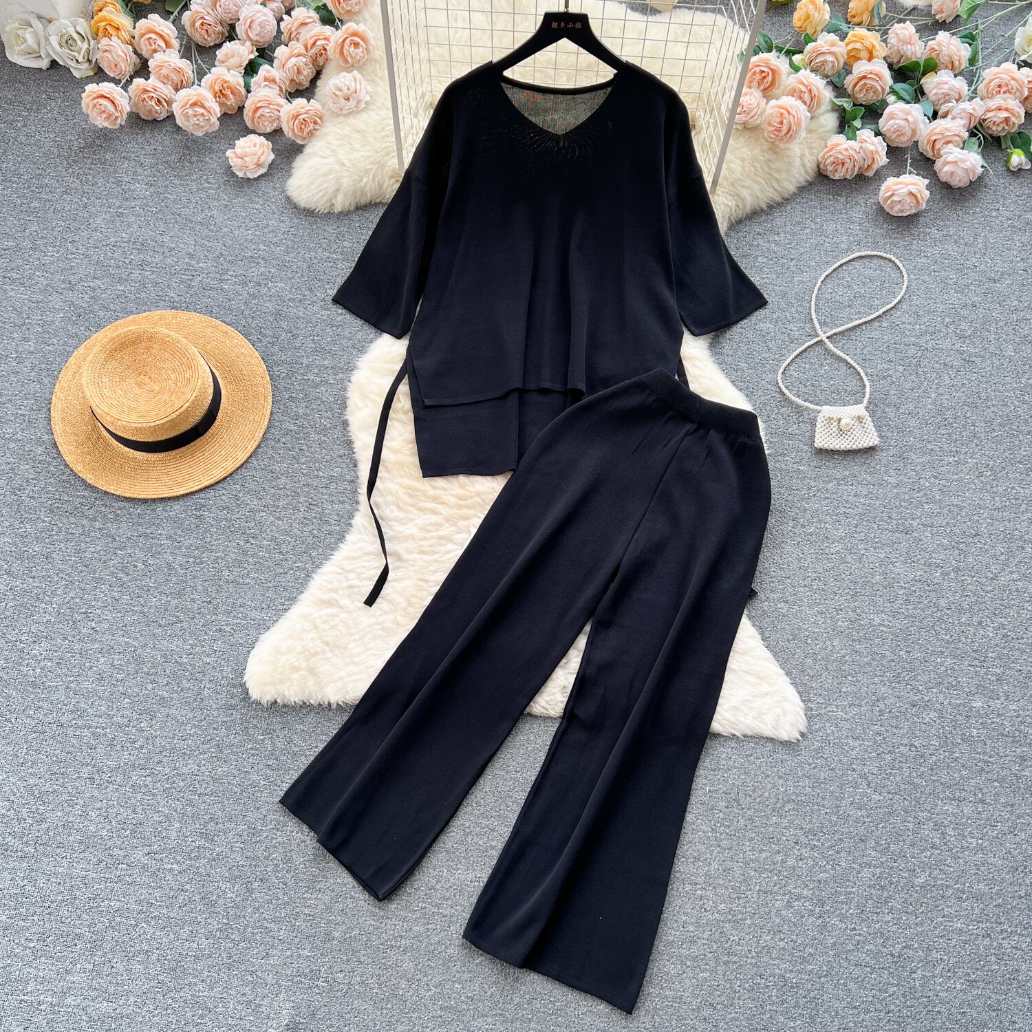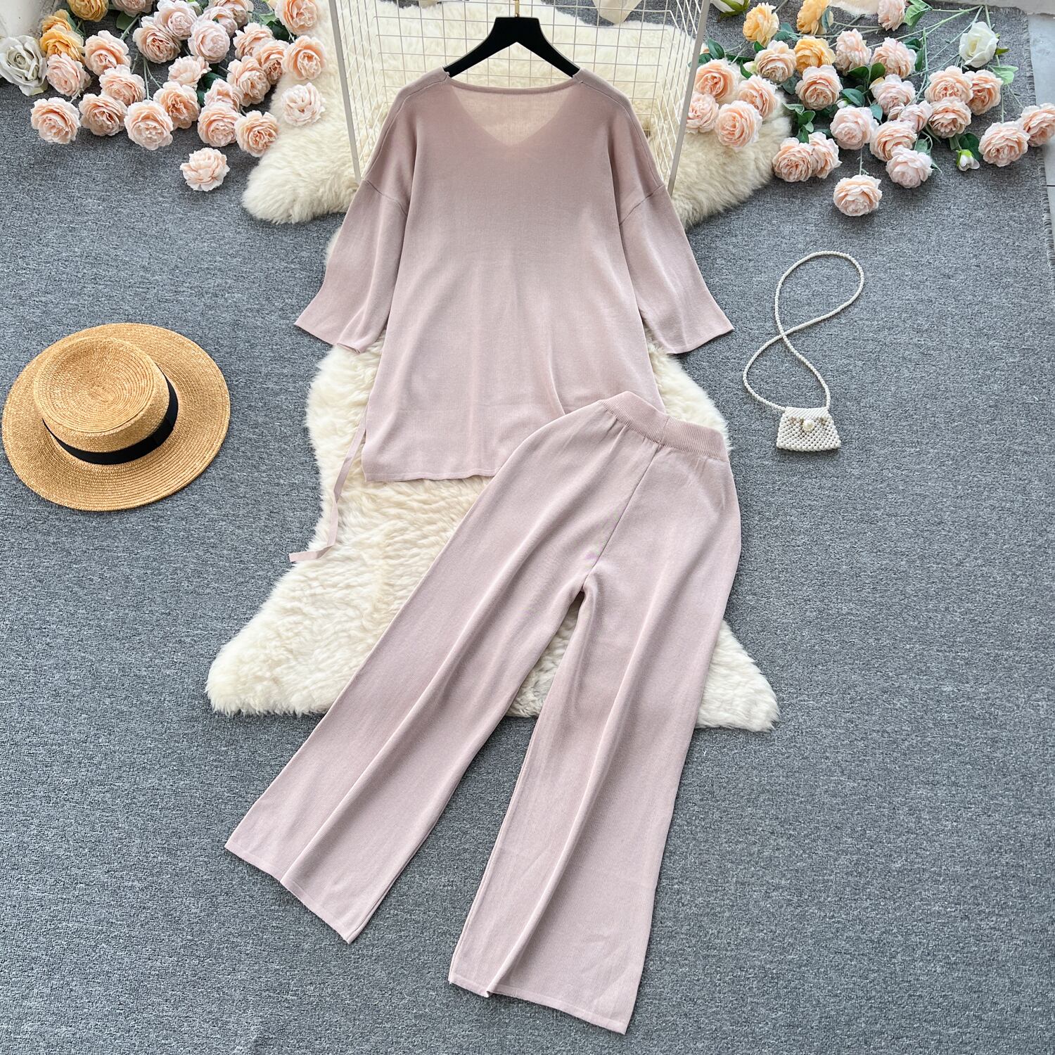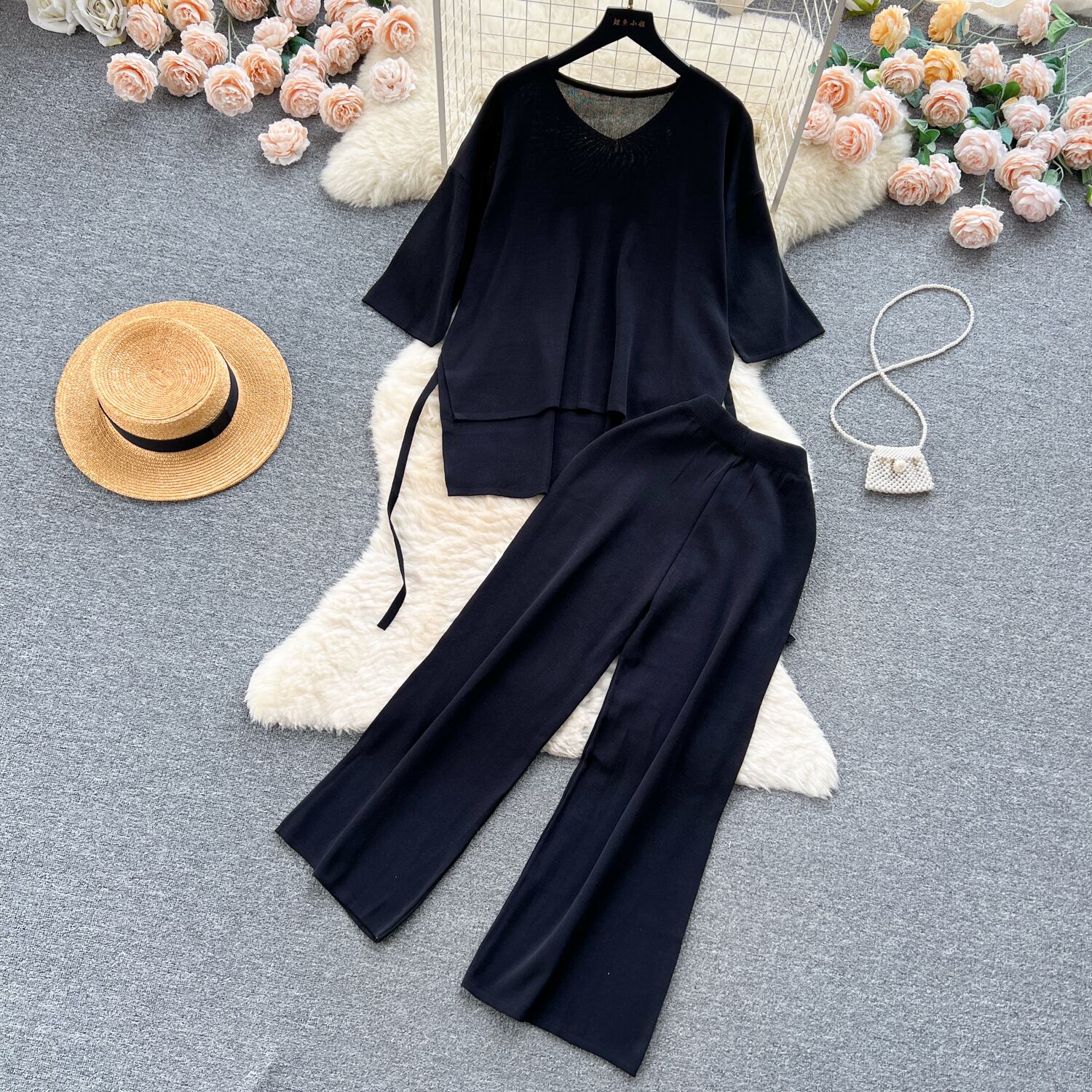 Nomikuma 秋カジュアルニットスウェットセット イレギュラーリボン半袖Vネックニットトップス+ウエストワイドパンツ ショート ハーフスリーブ オータム 秋物 ワイドレッグ