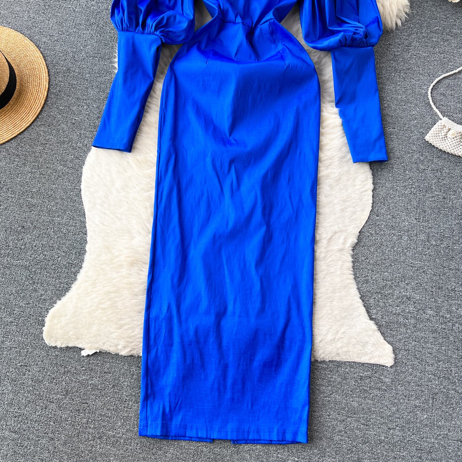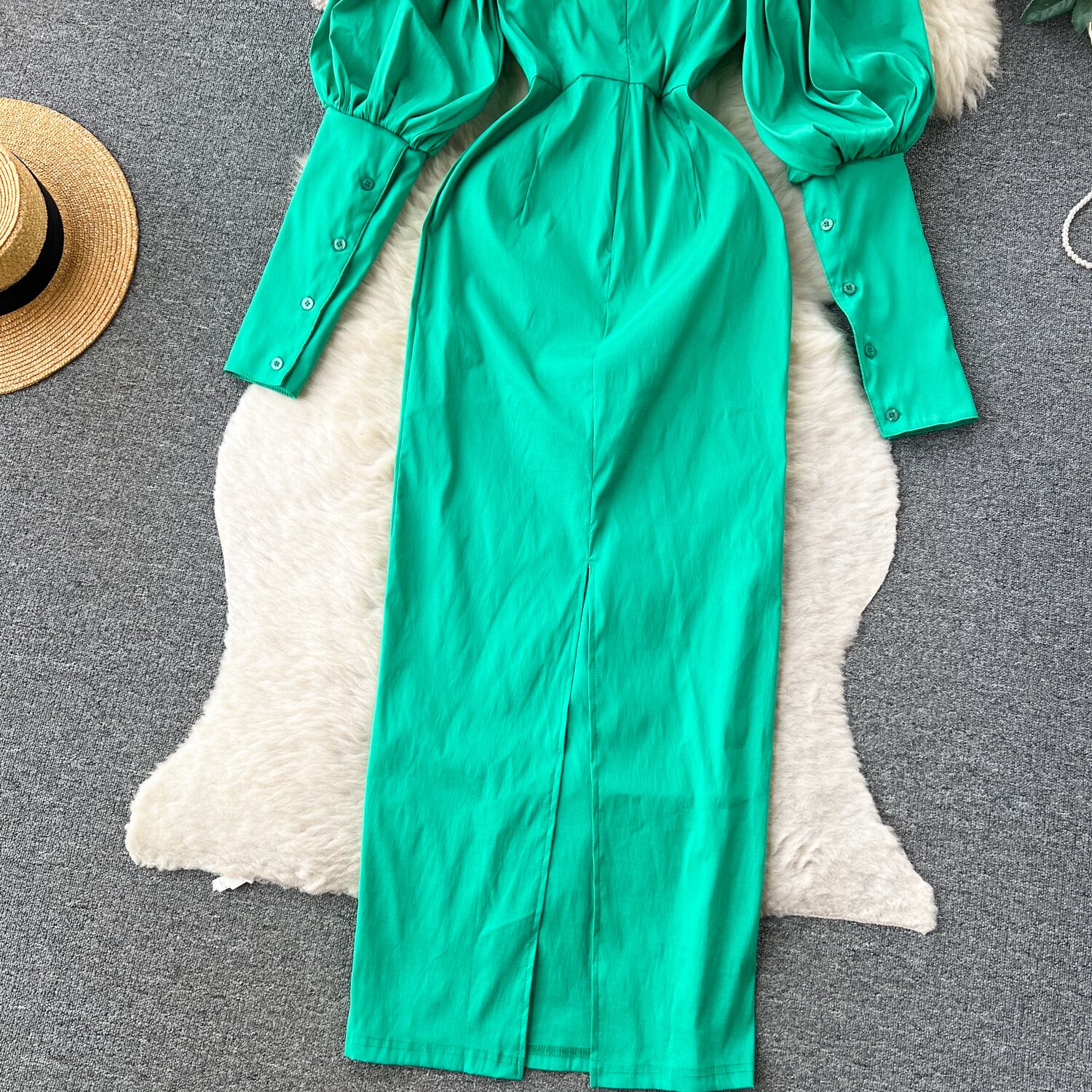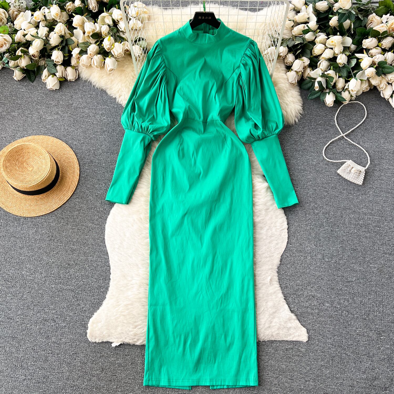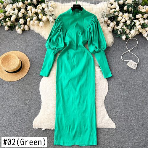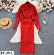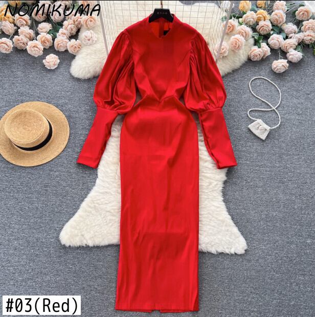 Nomikuam タートルネックパフスリーブドレス秋ソリッドスリムウエストロング Vestidos オータム 秋物 ソリッドカラー