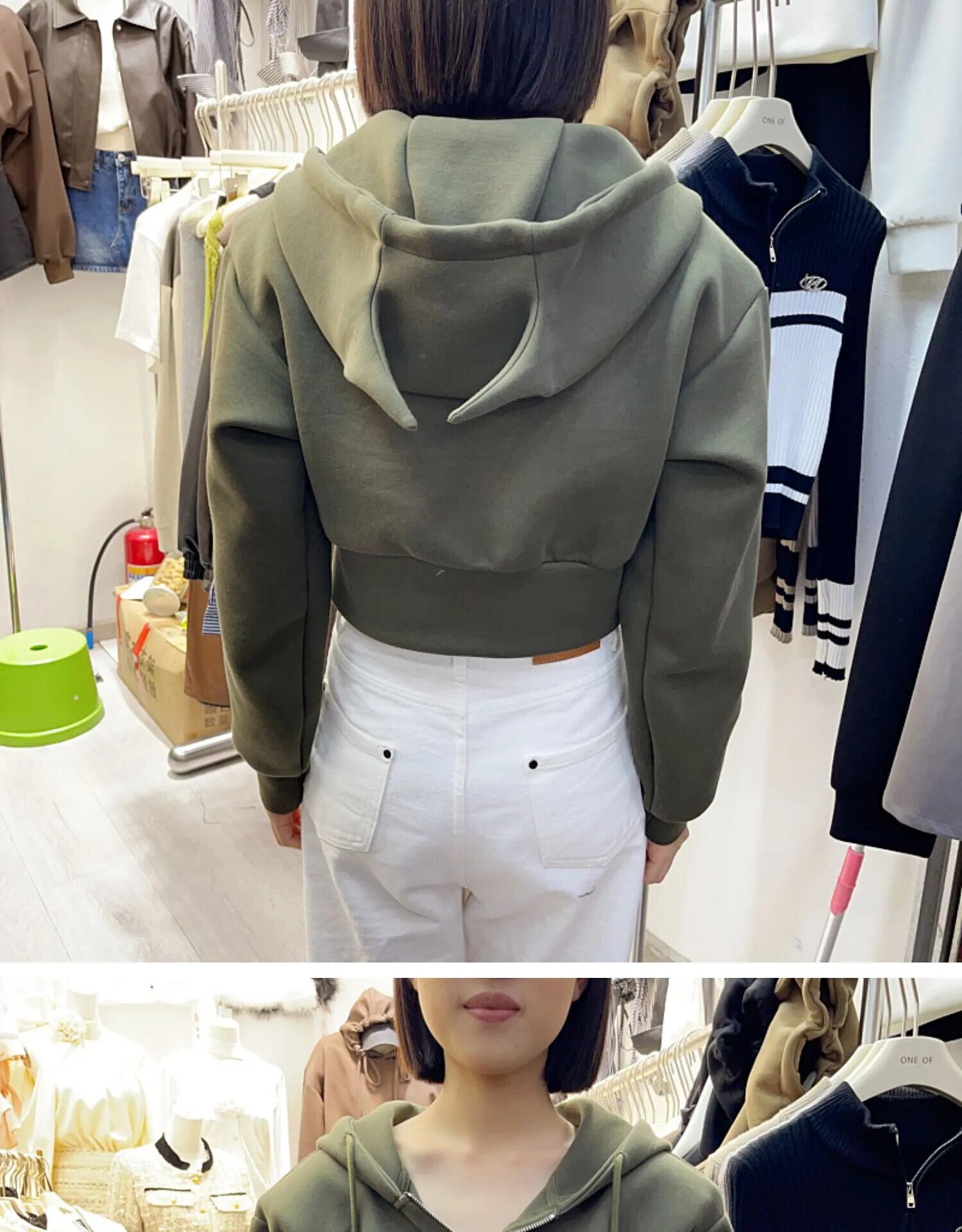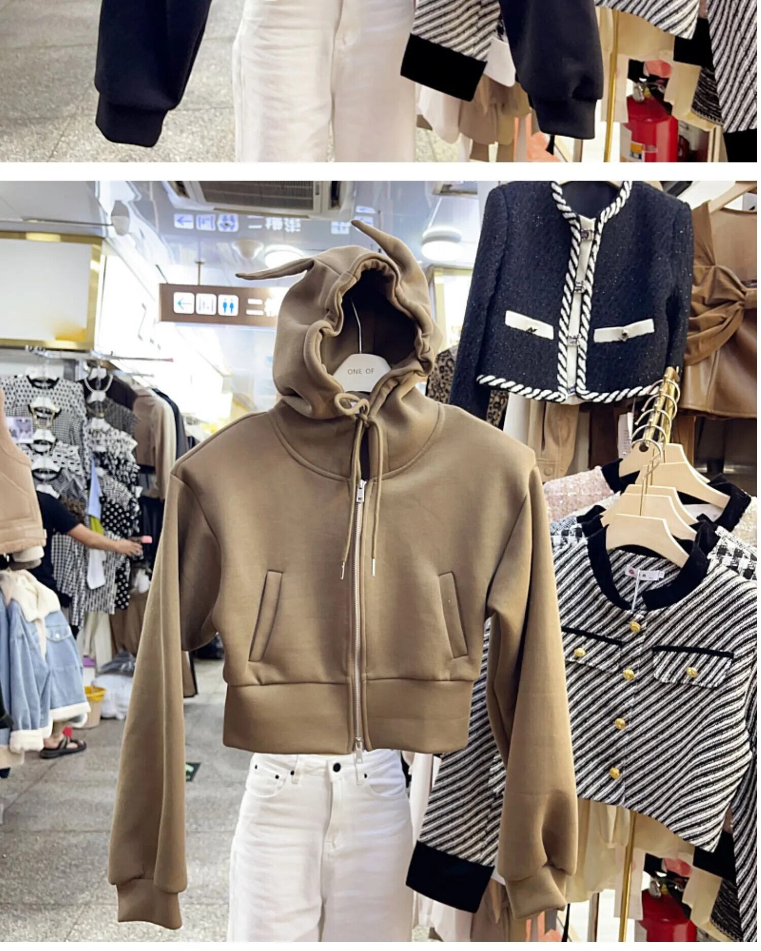 Nomikuma フード付き長袖トレーナー秋冬ソリッドジッパーショートコートトップス巾着ジップアップパーカー ロング オータム 秋物 ウィンター 冬物 ソリッドカラー