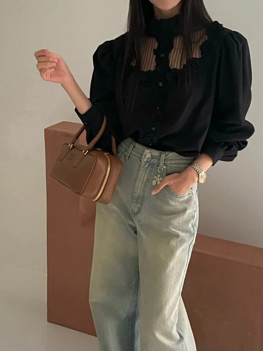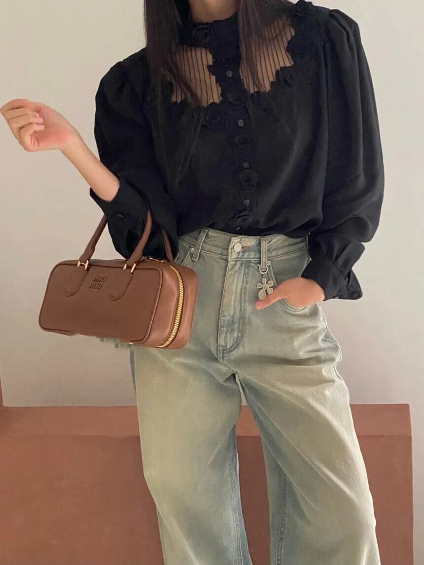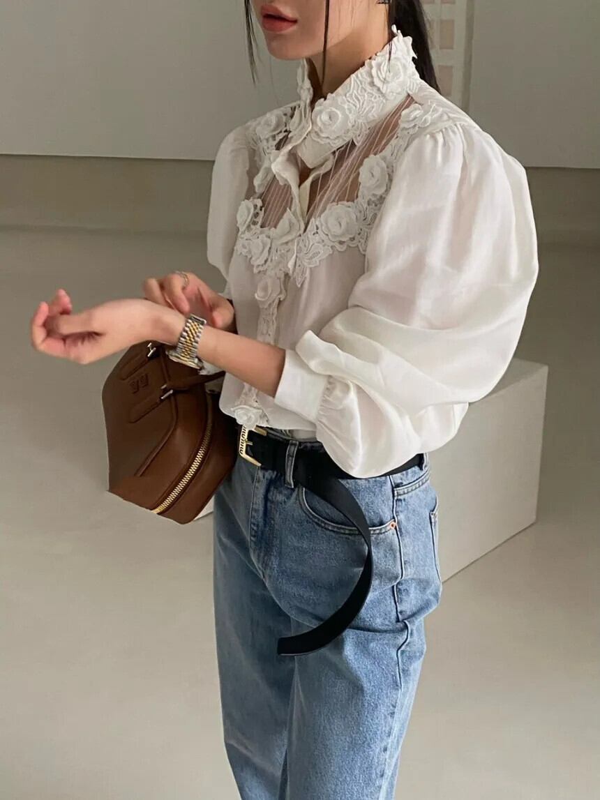 Nomikuma フラワースタンドネックメッシュパッチワークシャツ秋ブラウス Kroean De オータム 秋物 フラワーデザイン