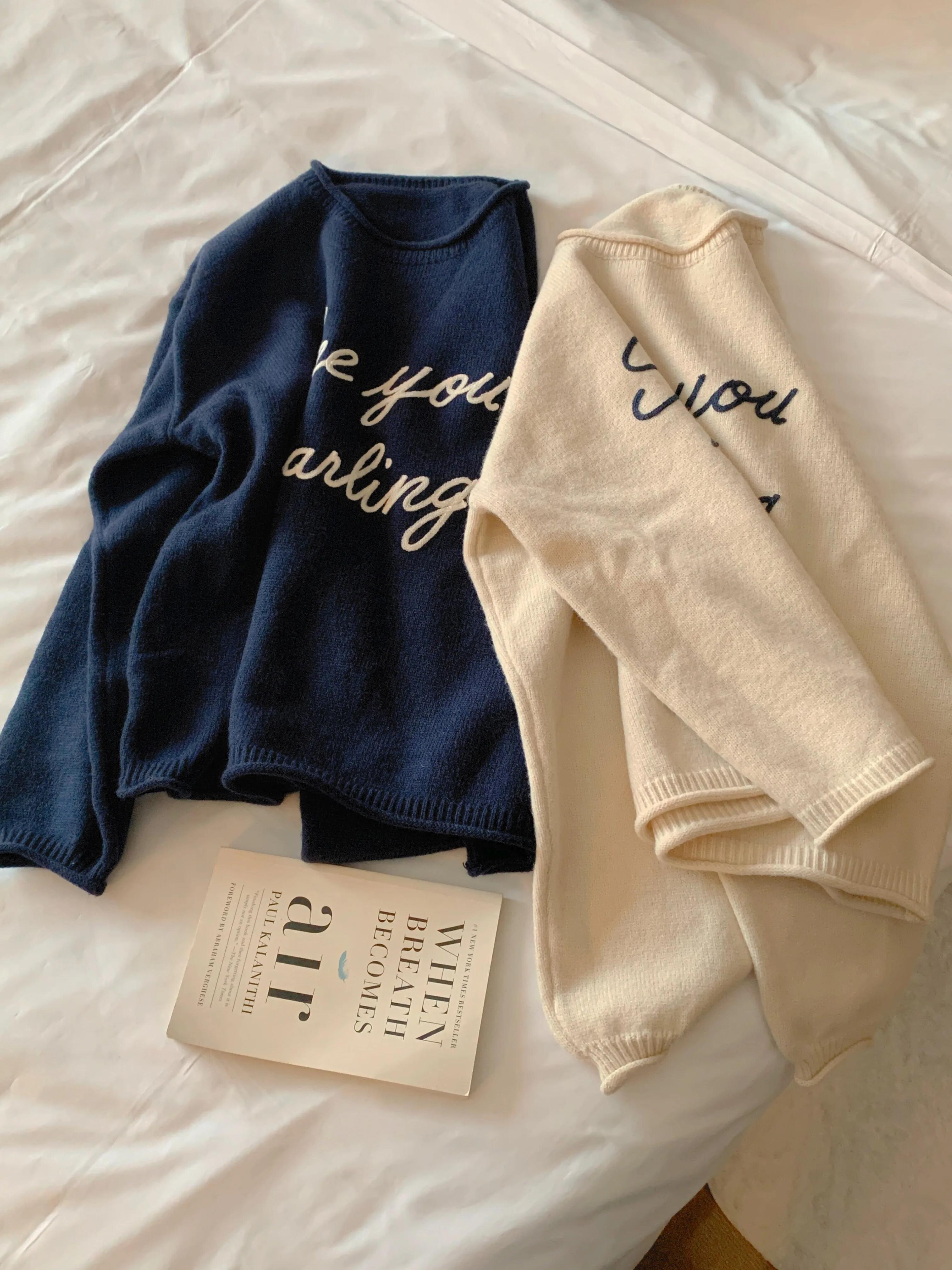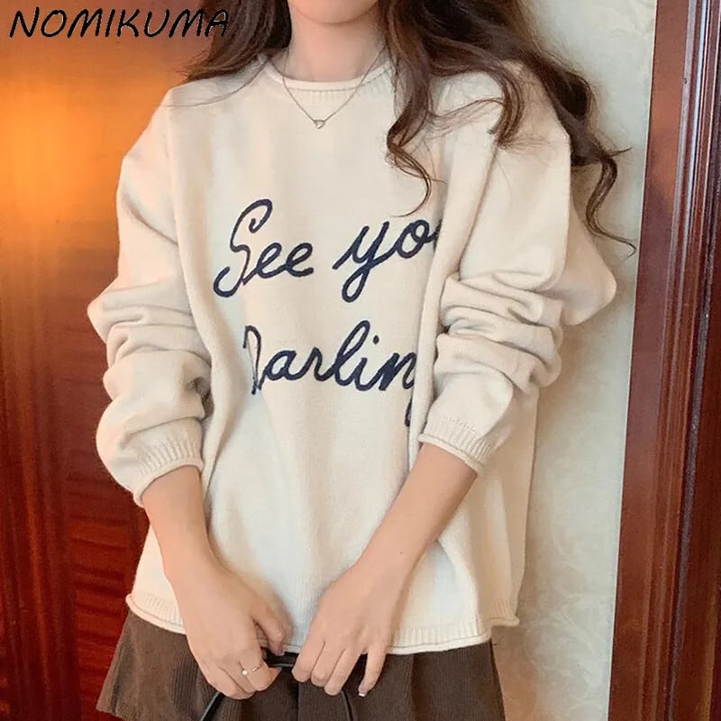 Nomikuma 秋冬プルレター刺繍セーター O ネックプルオーバーニットトップスセーター オータム 秋物 ウィンター 冬物 Oネック