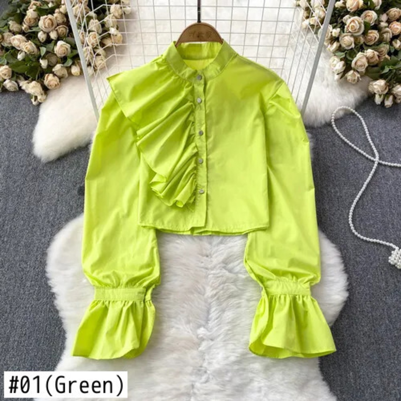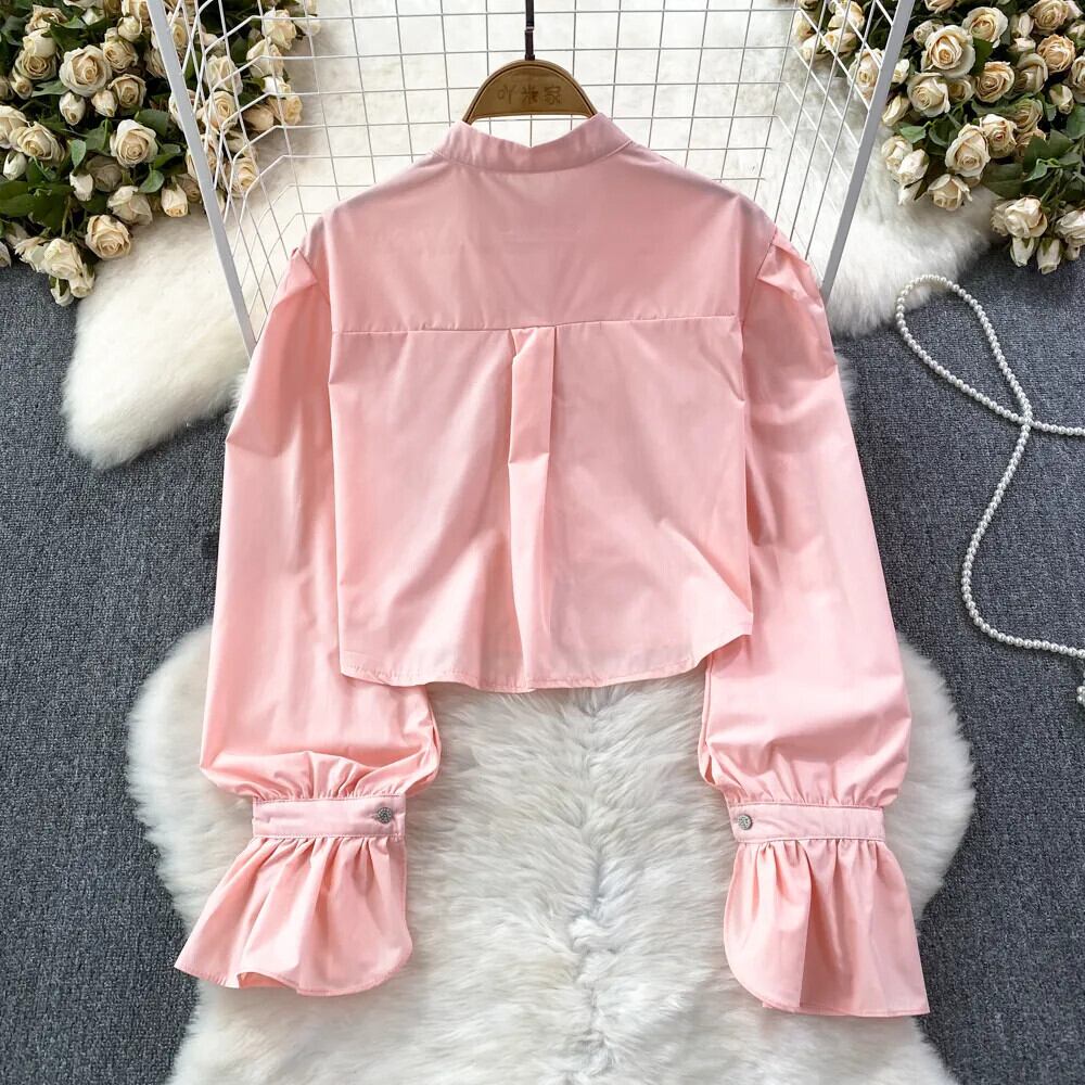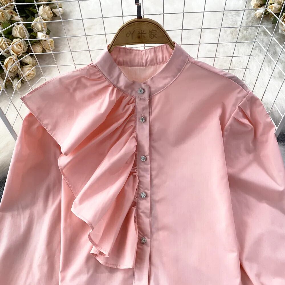 Nomikuma 秋フレア長袖スタンドネックフリルシングルブレストカジュアルブラウストップスショートシャツ ロング オータム 秋物