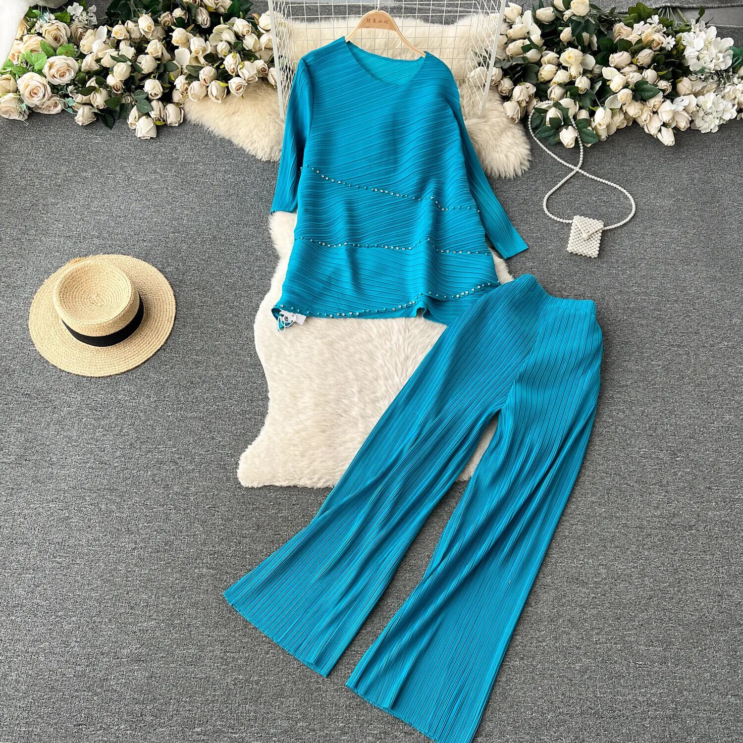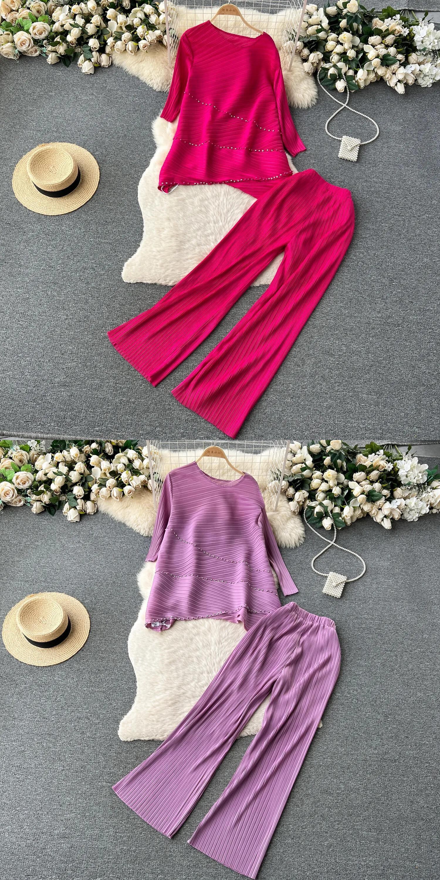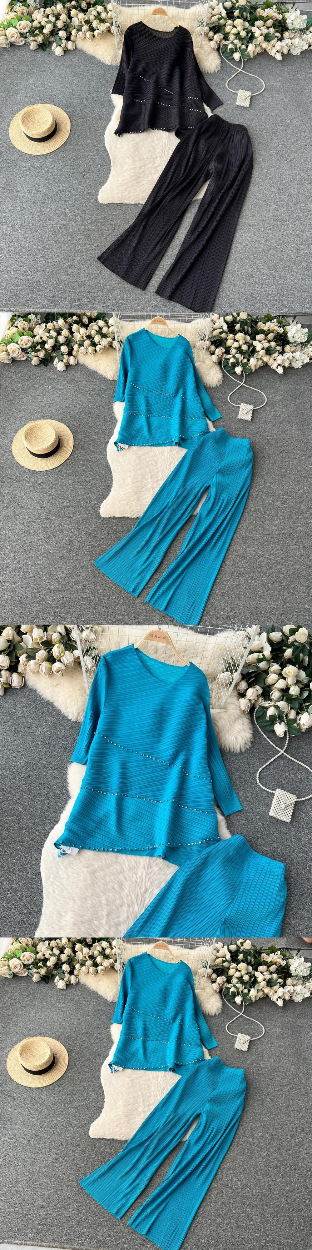 Nomikuma 折り目 2 枚セットカジュアルスキューカラービーズダイヤモンド T シャツ + ウエストワイドレッグロングパンツ ワイドパンツ Tシャツ