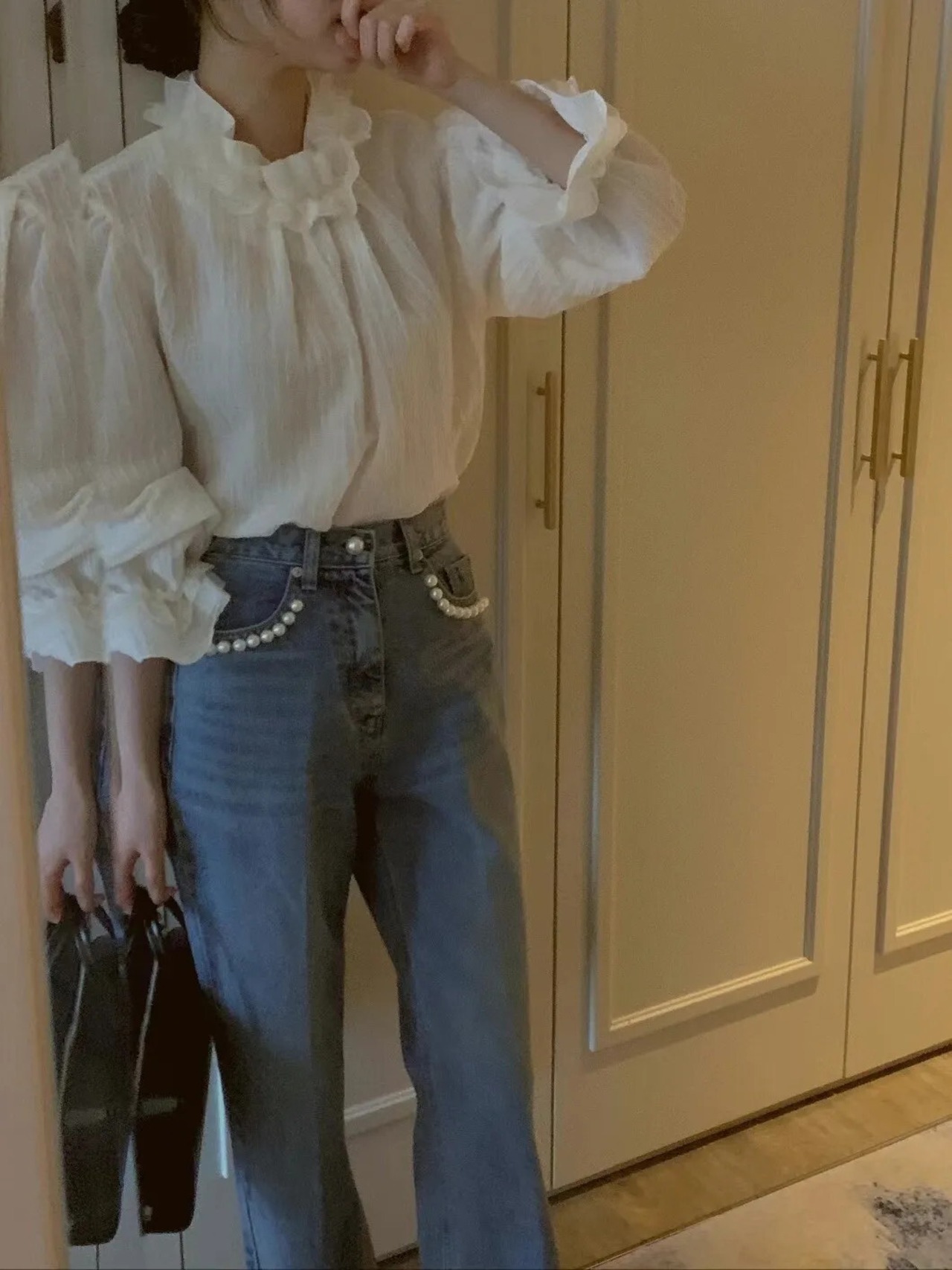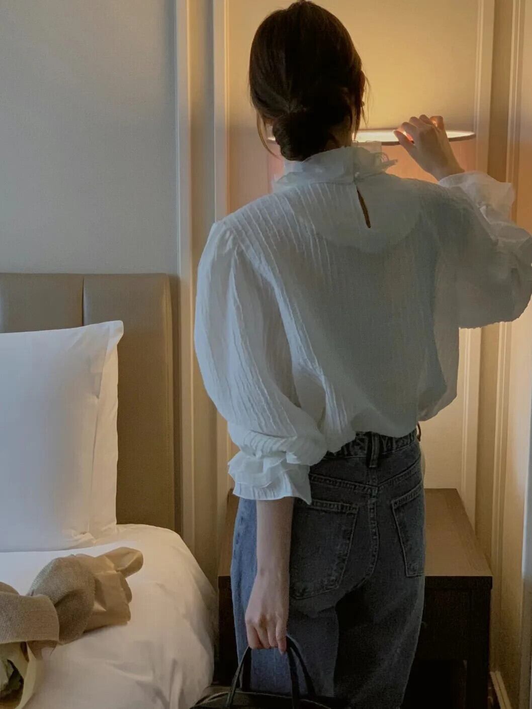Nomikuma シックフリルスタンドネックフレア長袖ブラウス秋シャツトップス Blusa ロング