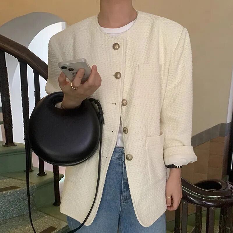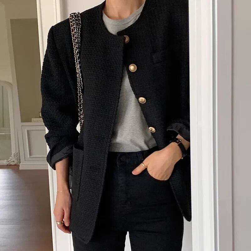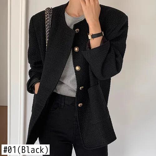 Nomikuma シック秋シック O ネックシングルブレスト因果ツイード長袖ソリッドジャケットコート ロング オータム 秋物 Oネック ソリッドカラー