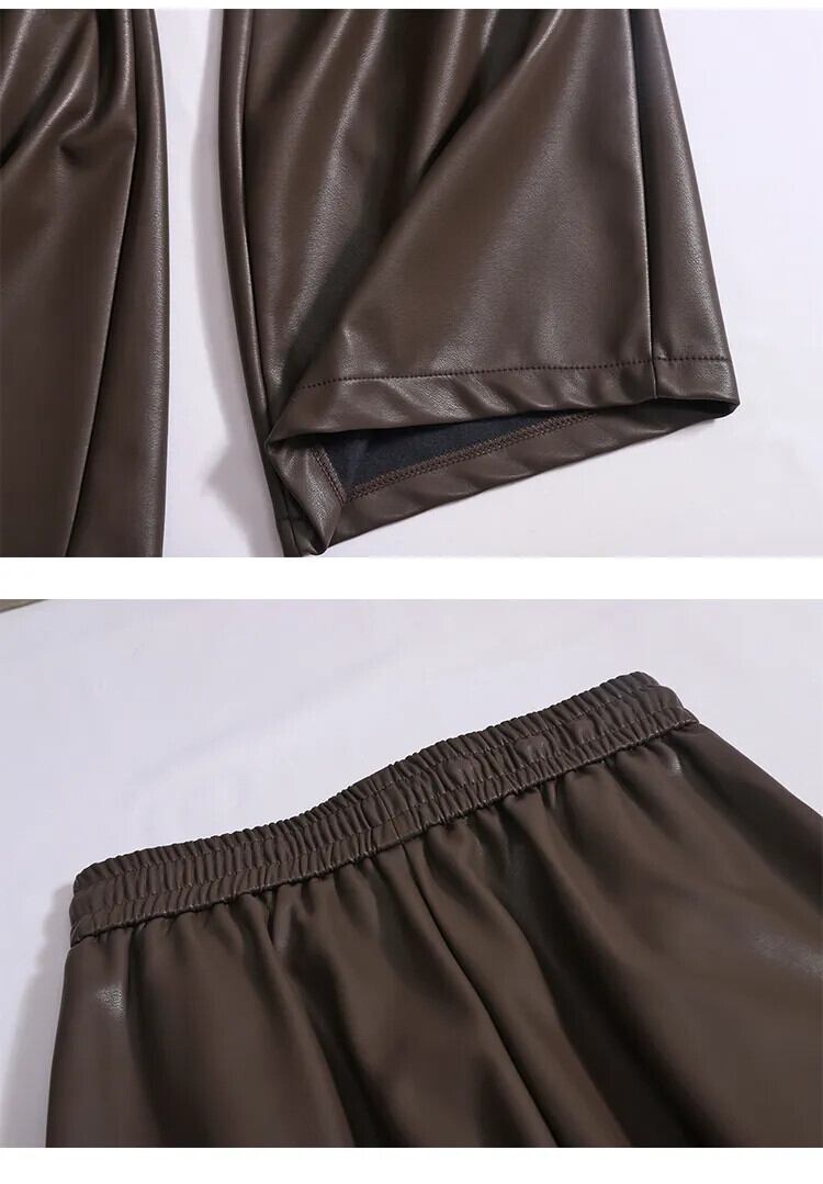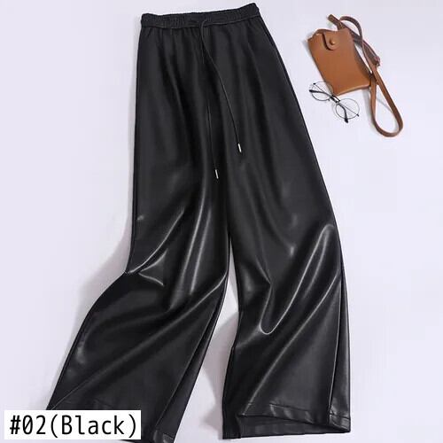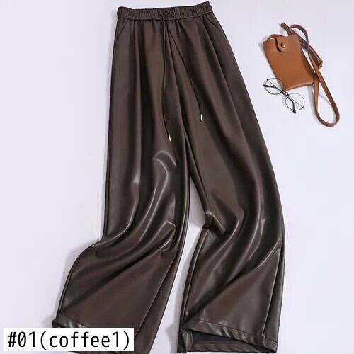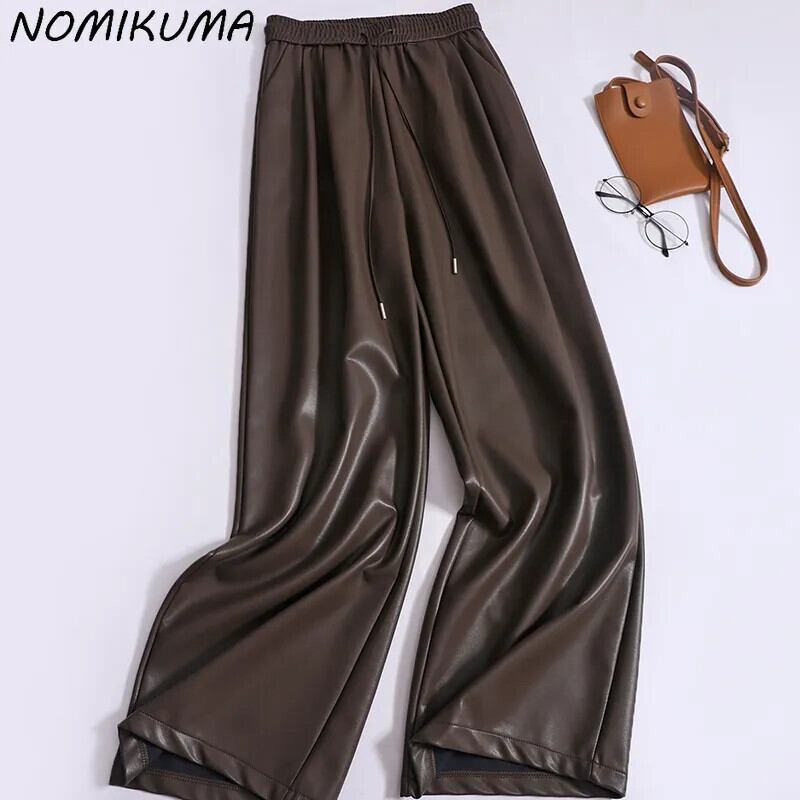 Nomikuma 秋 PU パンツ 弾性ウエスト ドローストリング ワイドレッグ パンツ レザー フロアレングス パンツ Pantalones エラスティック 伸縮 オータム 秋物 ワイドパンツ