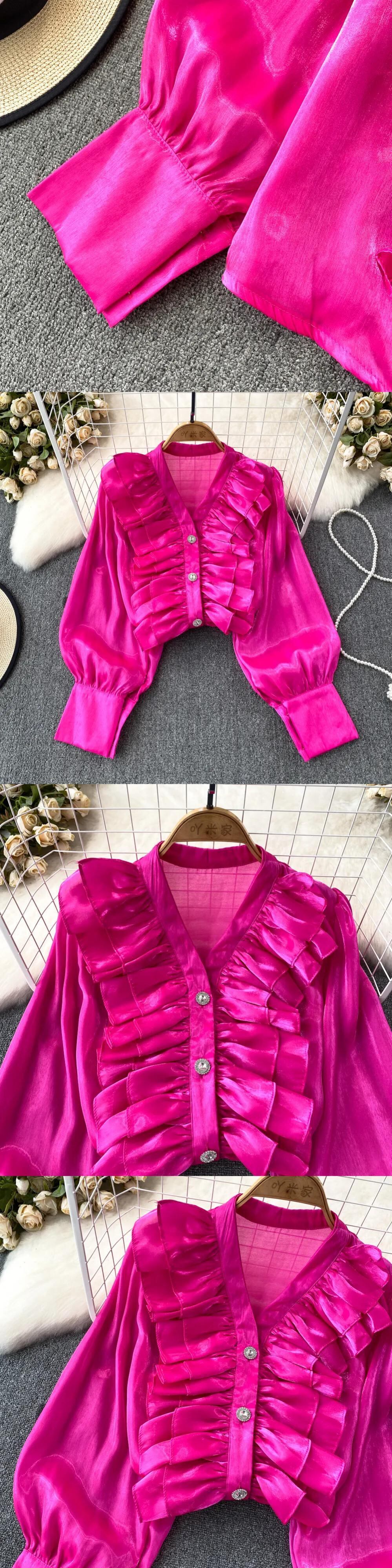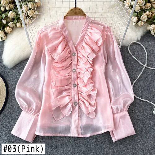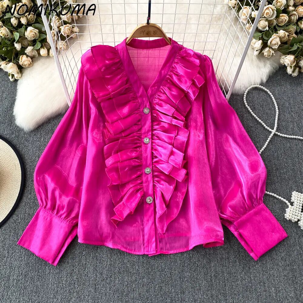 Nomikuma 長袖 V ネックシャツシックフリルパッチワークブラウス秋トップスデ ロング オータム 秋物 Vネック