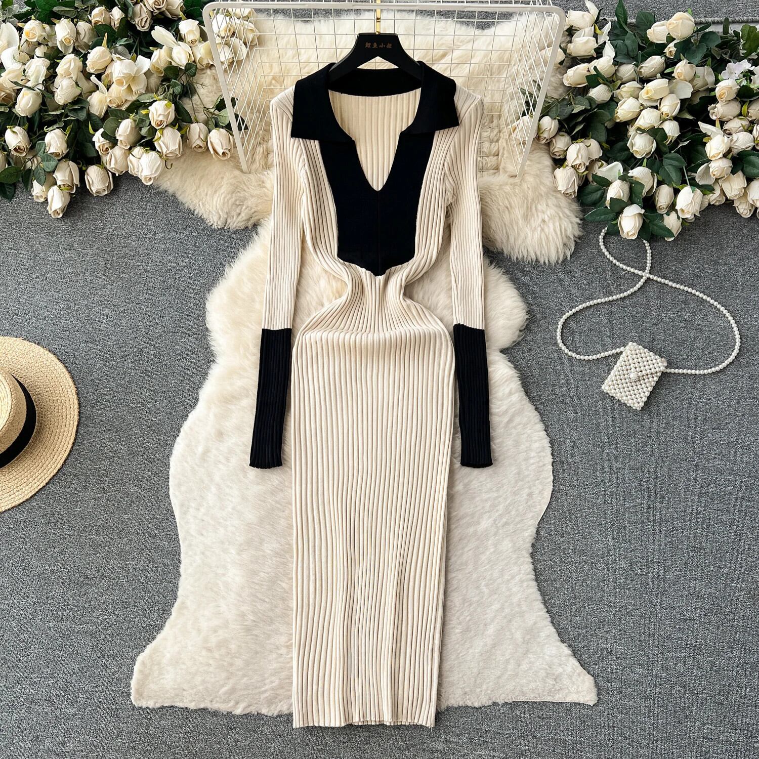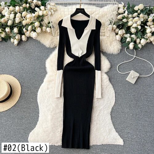 KUSAHIKI ヒットカラーターンダウン襟ニットドレス Womena Utumn 冬ストレッチスリムセータードレス秋冬 オータム 秋物 ウィンター 冬物