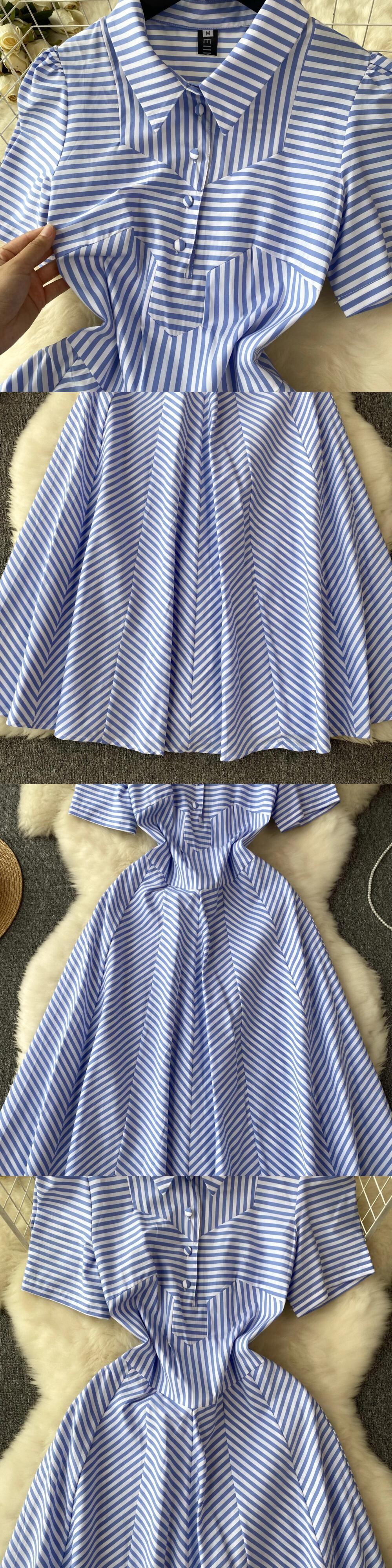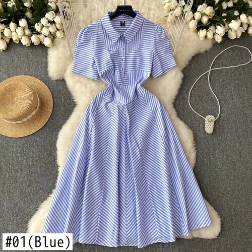 Nomikuma Vinatge ターンダウン襟パフスリーブストライプドレススリムウエストカジュアル A ラインロングドレス Aライン