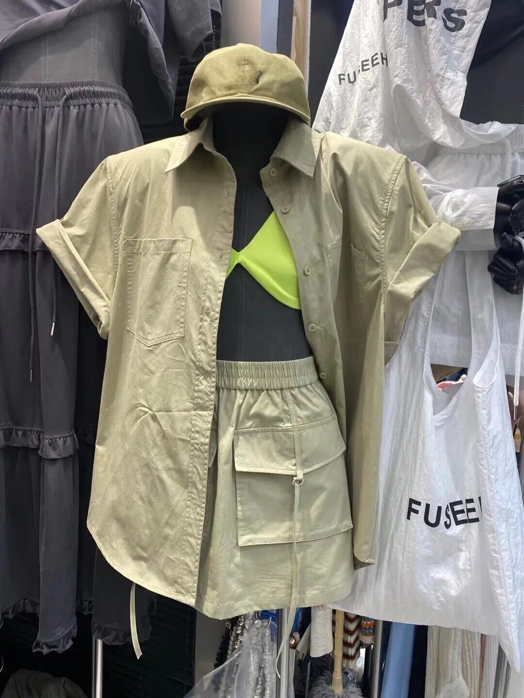 Nomikuma 夏ターンダウンカラー半袖ブラウス + レースアップウエストゴムカジュアルポケットカーゴスカート 2 点 ショート ハーフスリーブ エラスティック 伸縮 サマー 夏物