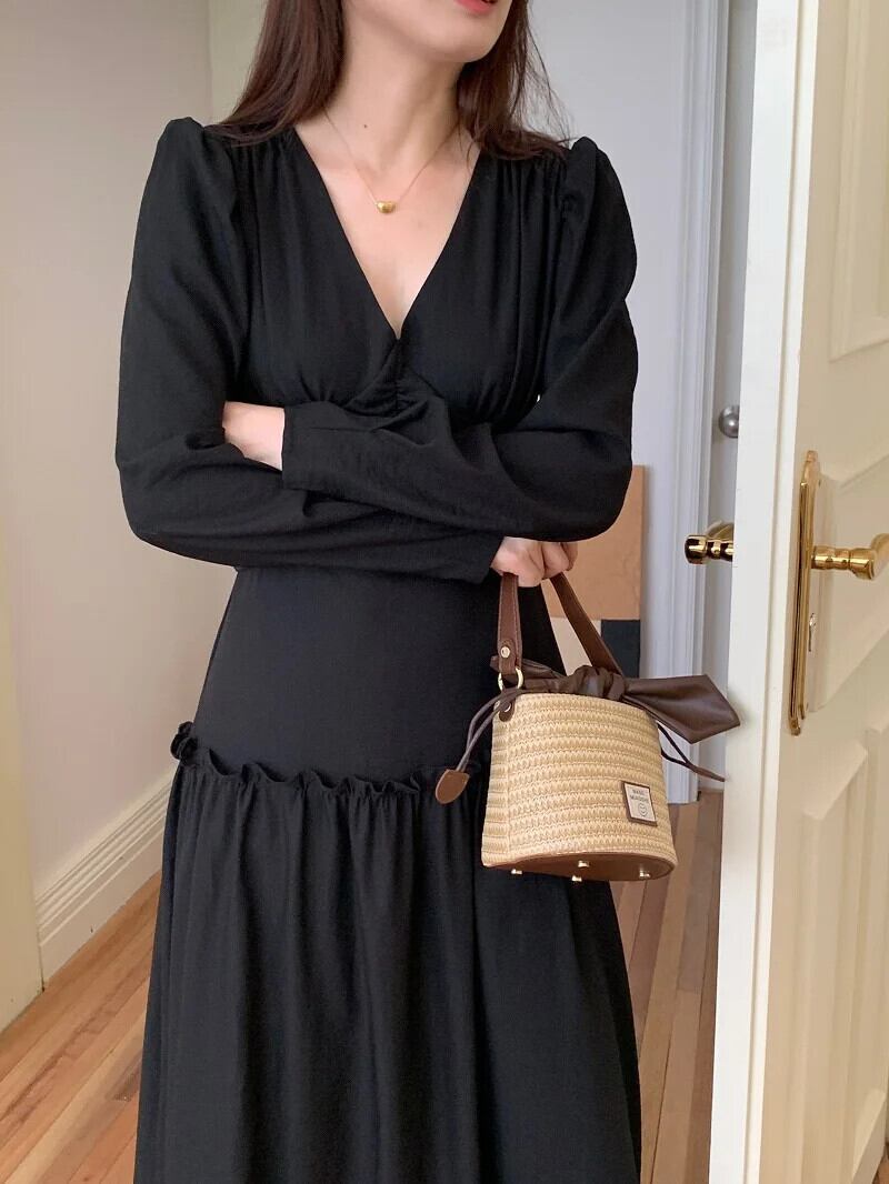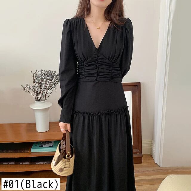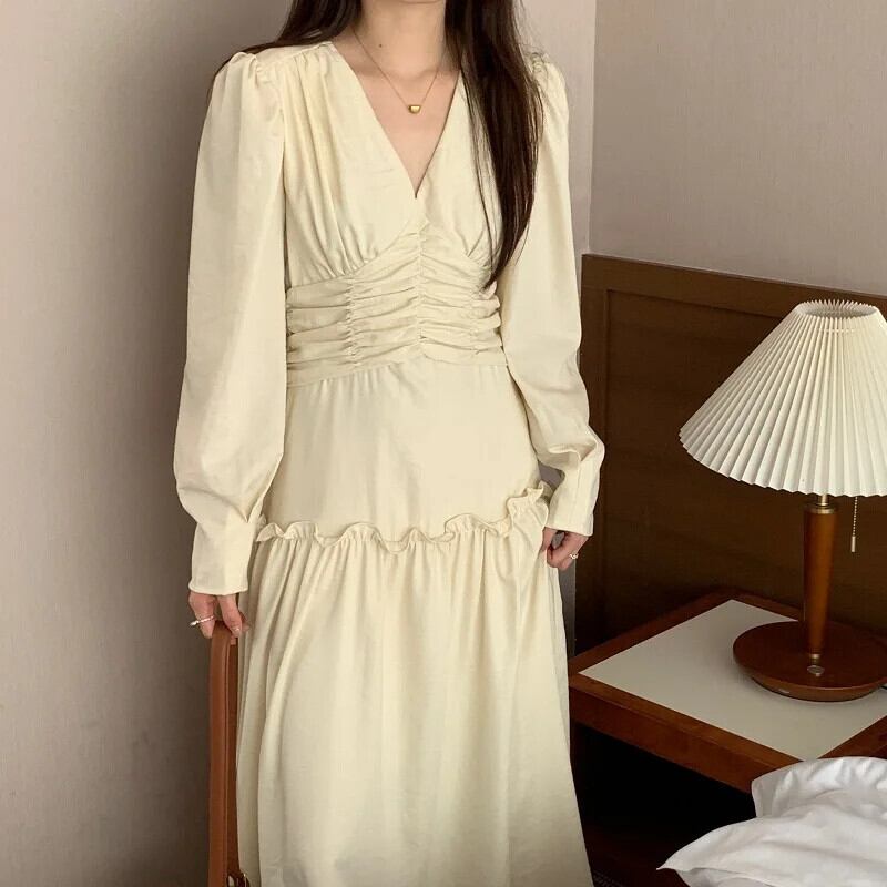 Nomikuma 秋 V ネックプリーツスリムウエストロングドレス長袖ドレスシックフリルパッチワーク A ライン Vestidos オータム 秋物 Vネック Aライン