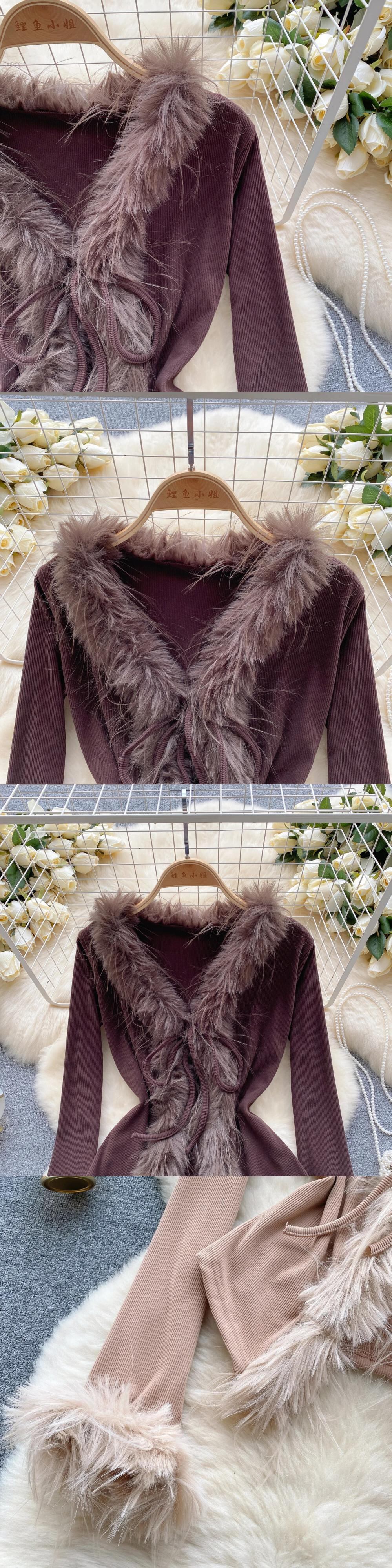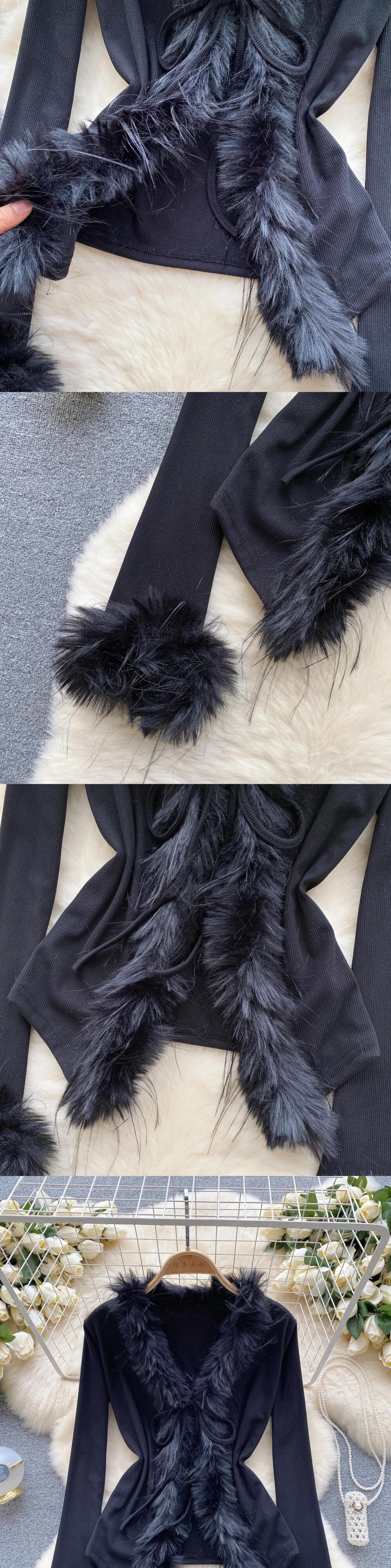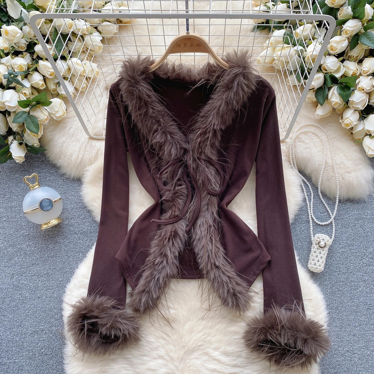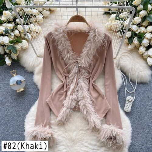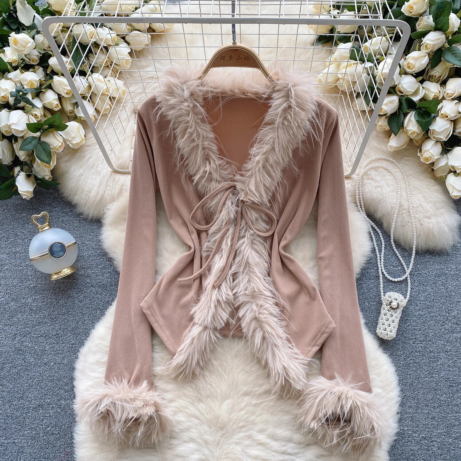 Nomikuma スパイシーガールニット秋シックファーパッチワーク包帯 V ネック長袖カーディガントップス ロング オータム 秋物 Vネック