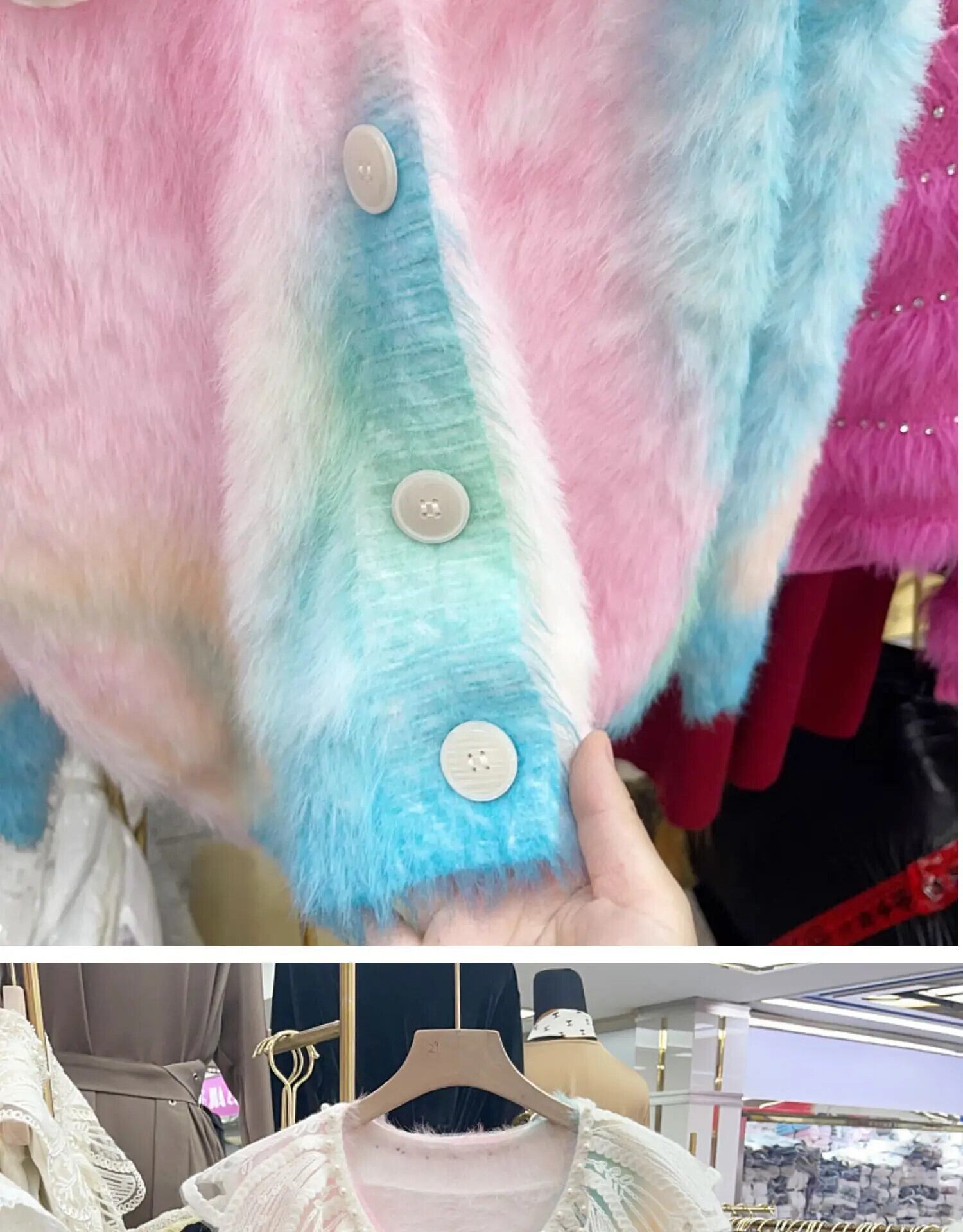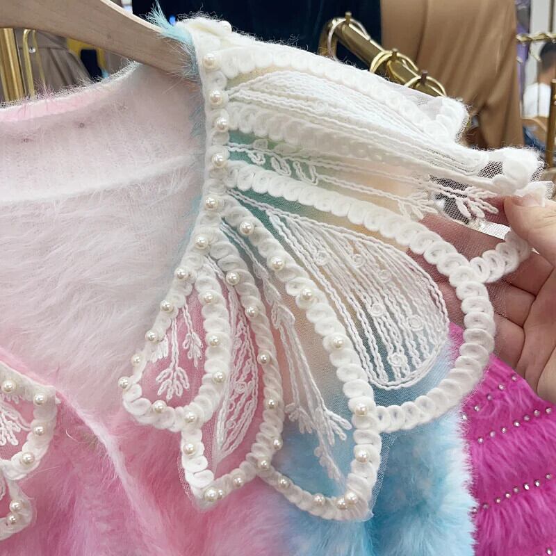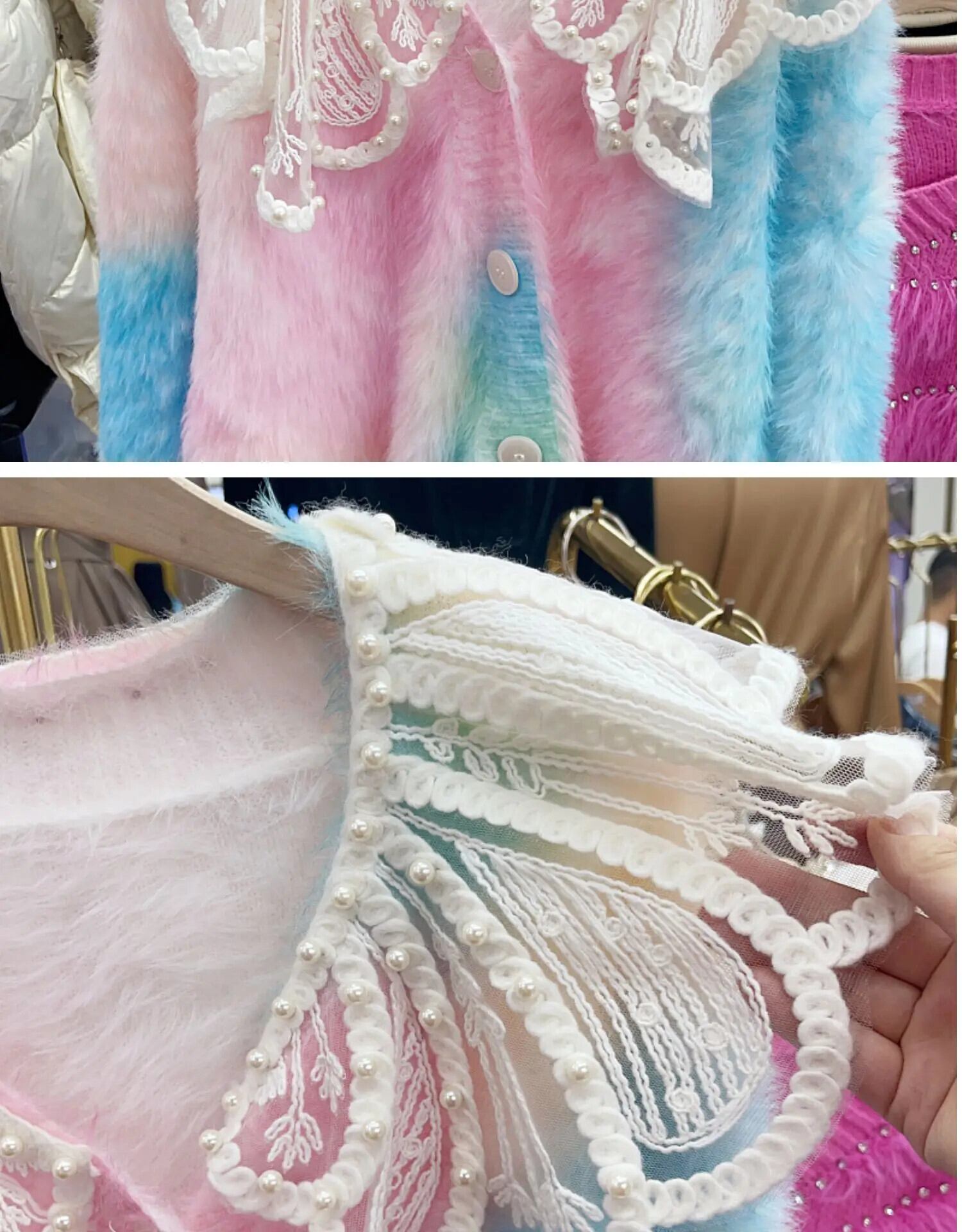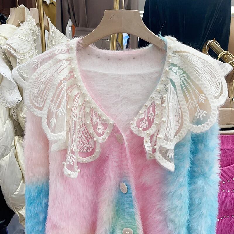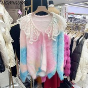 Nomikuma フェイクミンクカシミヤタイダイニットカーディガンシックビーズレースフリルパッチワーク V ネックセーターコートトップス ファー Vネック