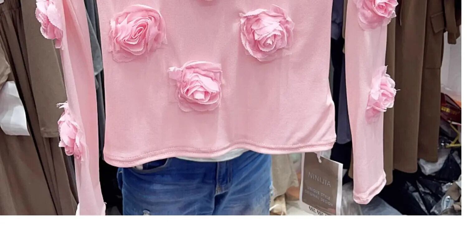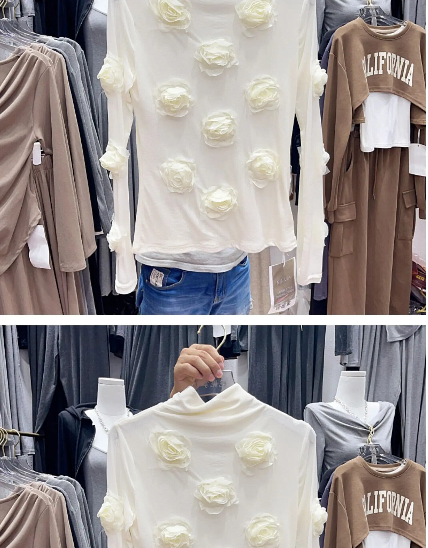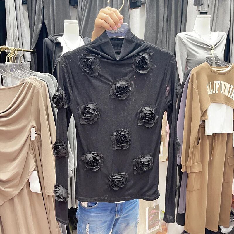 Nomikuma 秋冬 3D 花 Tシャツ 長袖 スリム ストレッチ ボトリング シャツ レディース ロング オータム 秋物 ウィンター 冬物 フラワーデザイン